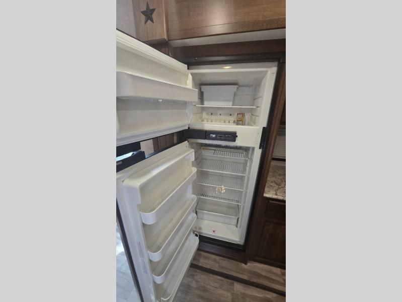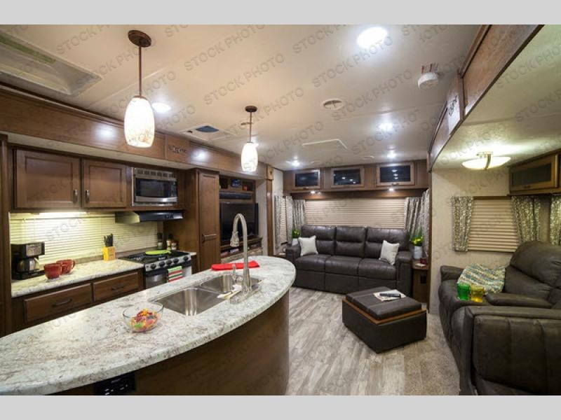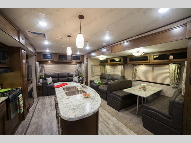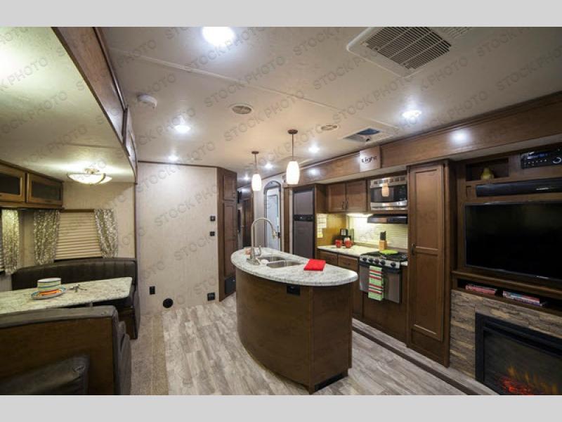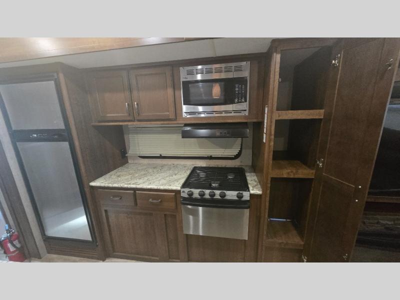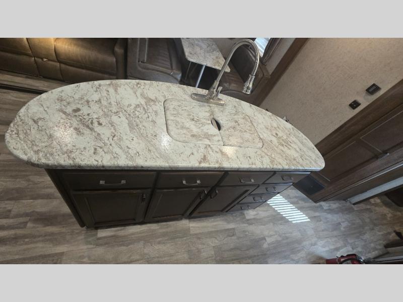 Along the curb side wall you will find a large slide out kitchen and entertainment center that starts with a refrigerator, a three burner range with overhead microwave, and a pantry. Overhead cabinets, lower cupboards and drawers provide ample storage for dishes and food items. The kitchen island off center features more counter prep space, plus it is the location of the double sink for easy clean up. At the end of this slide you will find an entertainment center with fireplace which can easily be viewed from any seating in the room.