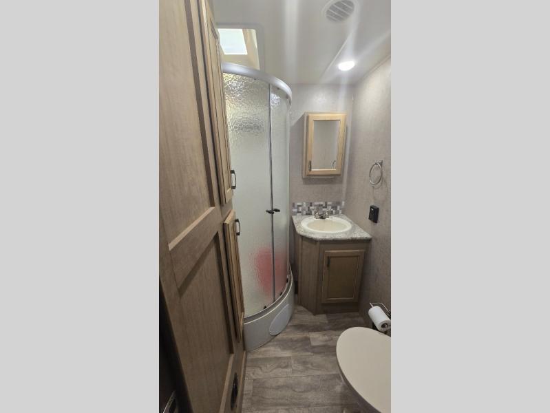 As you enter notice the convenient location of the bathroom straight ahead. Inside find a radius shower, toilet, sink, and linen cabinet.