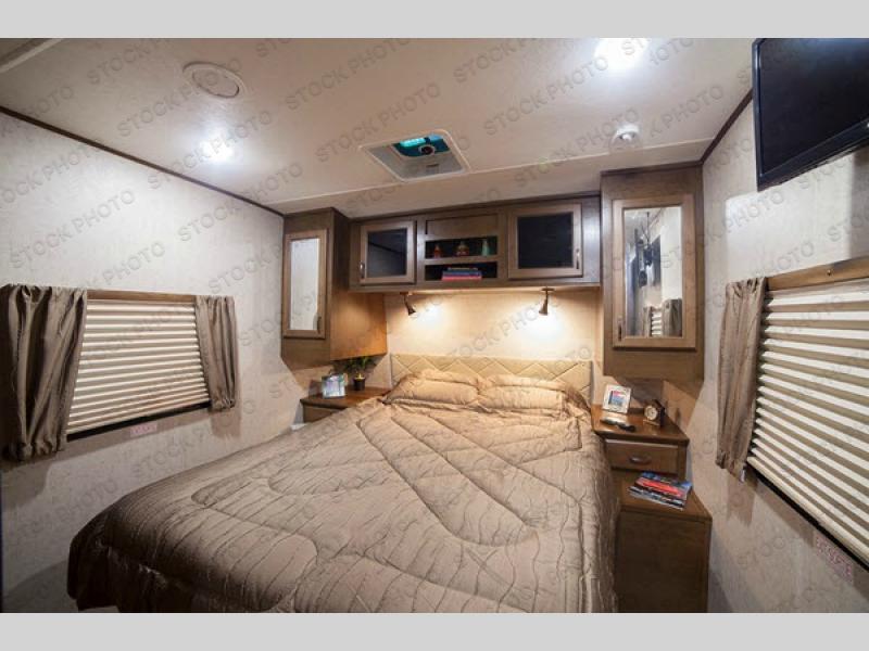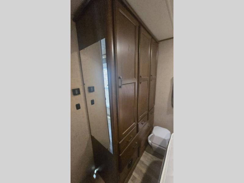 The front master bedroom features a large wardrobe for clothing storage, a queen size bed with overhead cabinets, and two shirt closets above nightstands, one on each side.