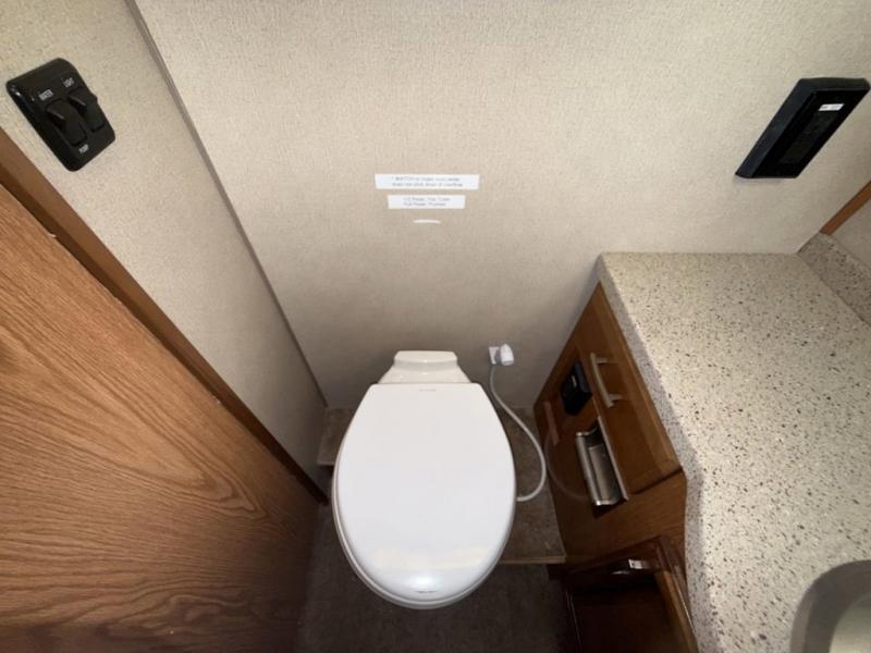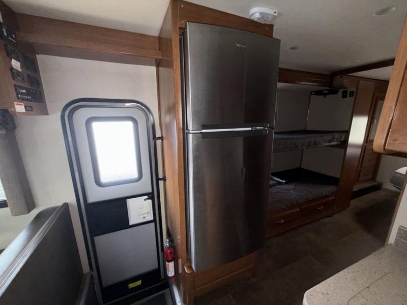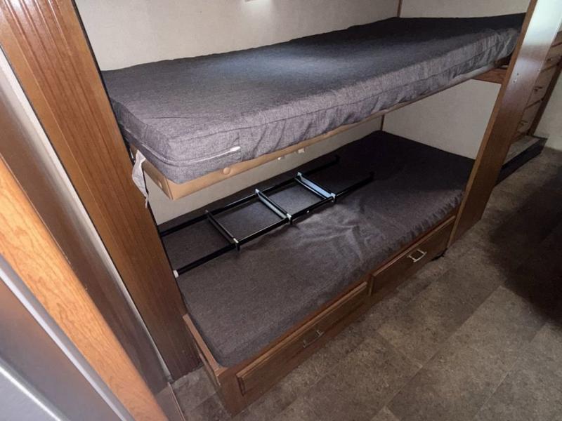 In the rear of the unit you will find a complete bathroom along the road side that features a tub/shower, toilet, and vanity with sink, plus overhead storage. Opposite the bathroom a slide out begins with a set of bunks for the kids. Continuing within the curb side slide find some storage space with a dresser and wardrobe, plus a 32" LED TV. Opposite enjoy sleeping on the queen size bed that features nightstands and a bit of overhead storage too. A sliding door can easily separate the bedroom area from the rest of the coach, plus so much more!