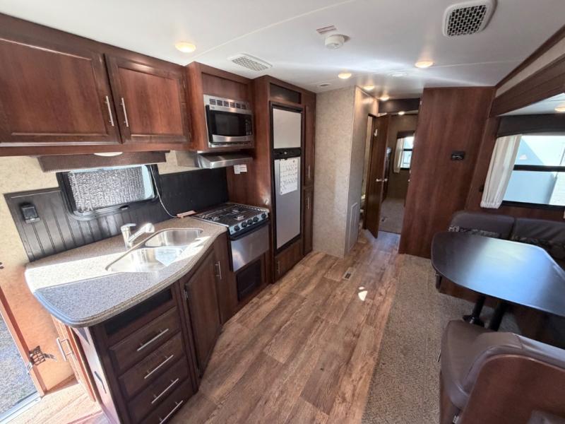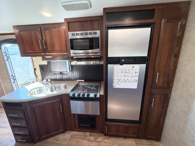 As you enter the travel trailer, to the left is an angled double kitchen sink, three burner range, microwave, refrigerator, and a pantry. The opposite side of the trailer offers a slide with an u-dinette or choose a table with chairs, and a hide-a-bed sofa. Next to the sofa is an entertainment center and a bench with storage.