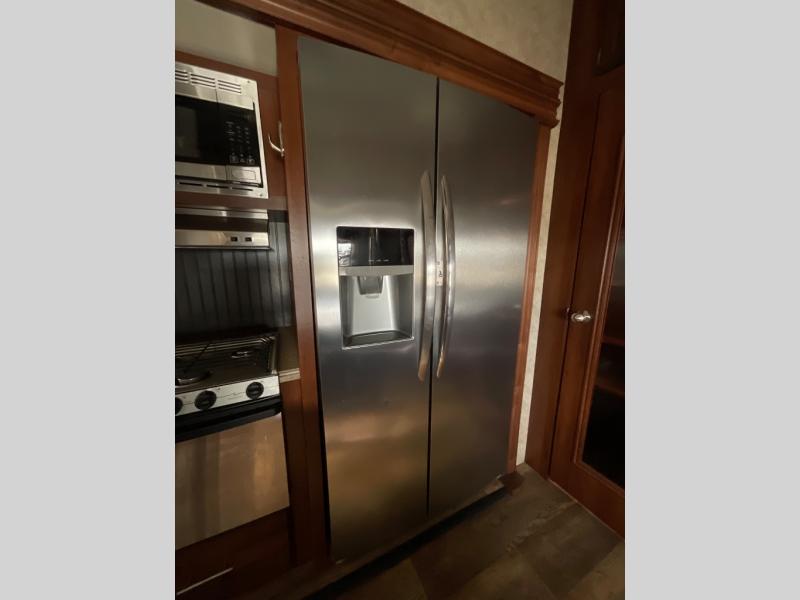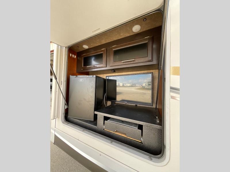 A few options inside include a table and chairs, theater seats, a king bed, and a 12 or 23 cu. ft. refrigerator.