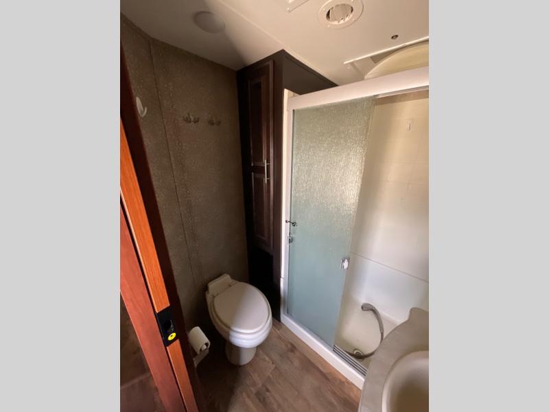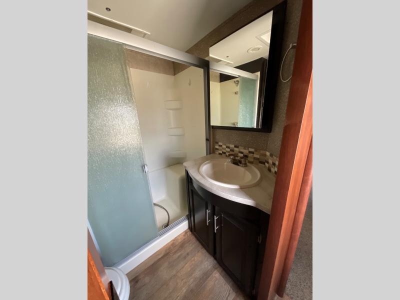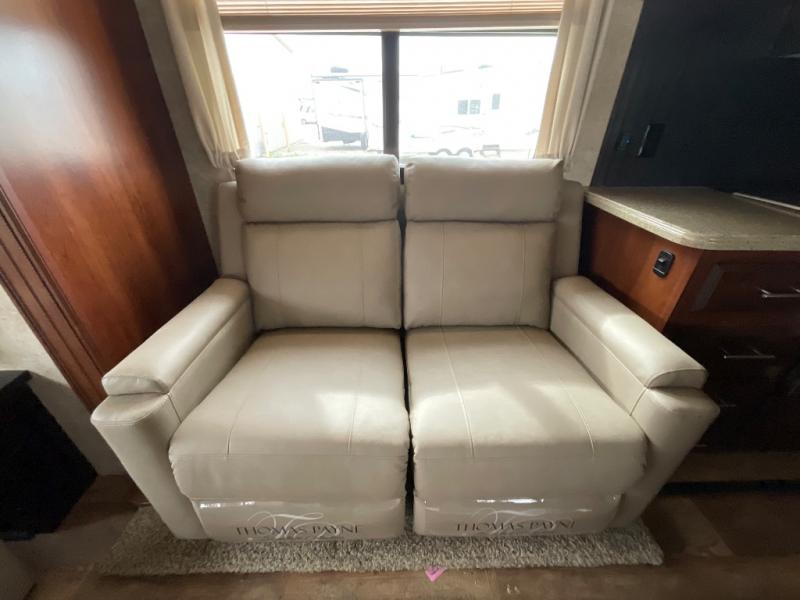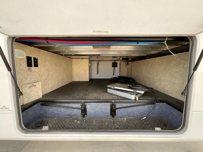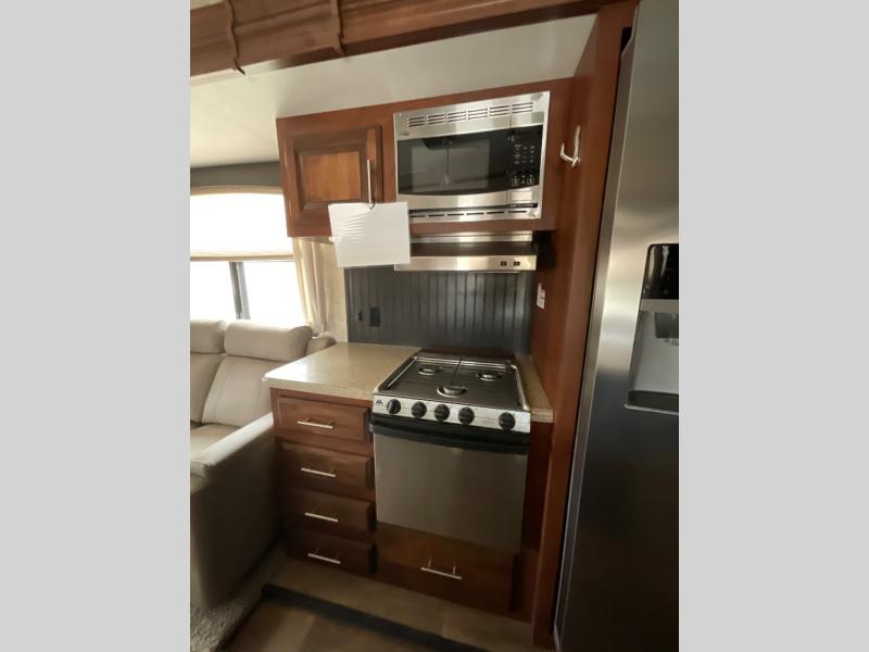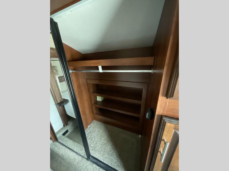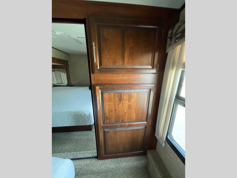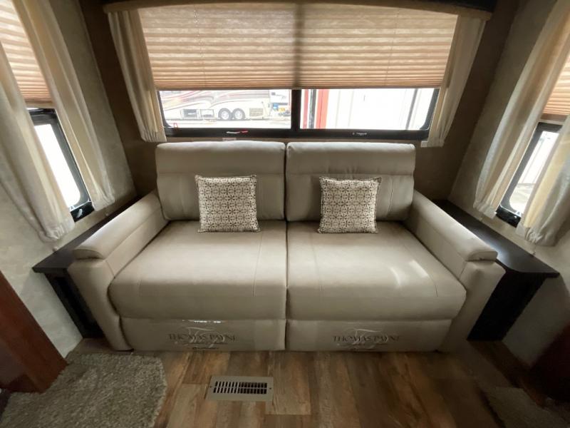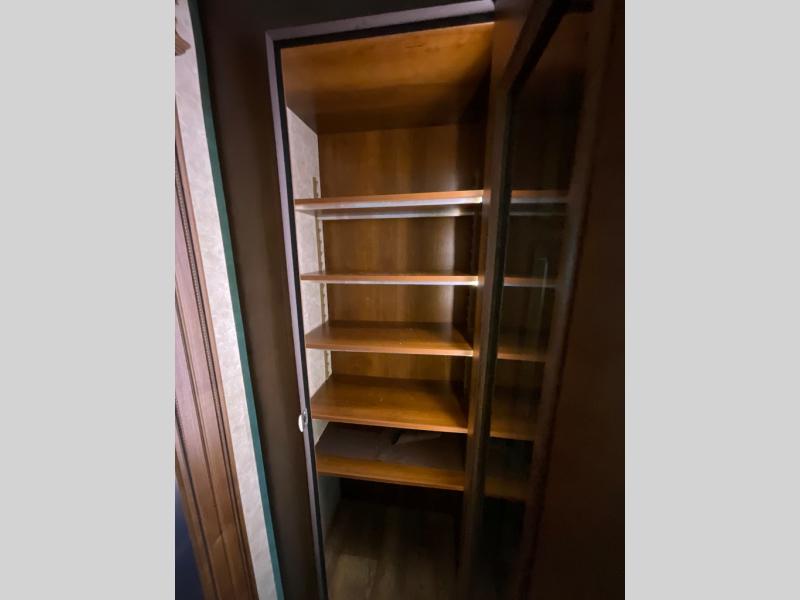 The other slide out in the main living area includes a theater sofa with cup holders, a microwave, a three burner range, a pantry, and a refrigerator. Adjacent to the slide out you will enjoy a walk-in pantry for storing your food items, a closet and an overhead cabinet. The double kitchen sink is located in the large kitchen island.