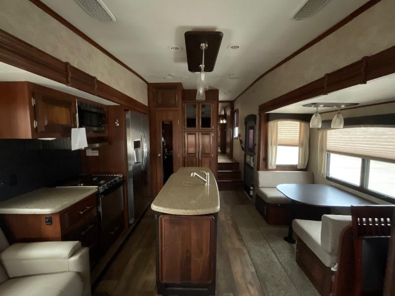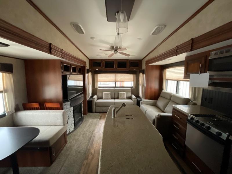 Stepping inside this Eagle 317RLOK fifth wheel by Jayco you will find that there is a rear living area, ceiling fan, kitchen island, front bedroom, outside kitchen, plus more!