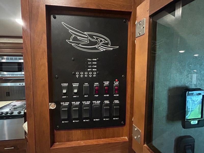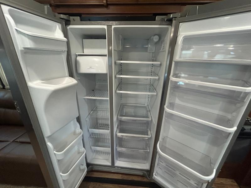 Along the rear wall there is an entertainment center with a fireplace. There is an additional slide out with a tri-fold sofa, pantry, refrigerator, microwave, and three burner range along the road side. Along the interior wall in the kitchen area you will find a counter which provides extra counter space, overhead cabinets, and a double kitchen sink. Enjoy the extra counter space of the optional rolling island, plus the convenience of moving it around to the best spot for you.
