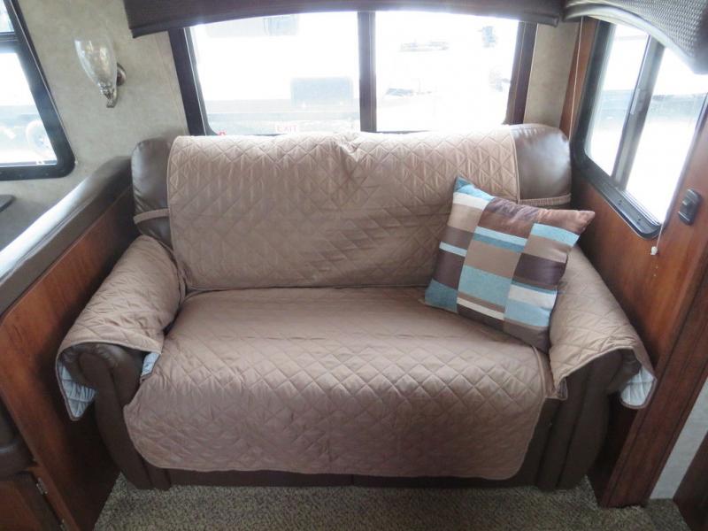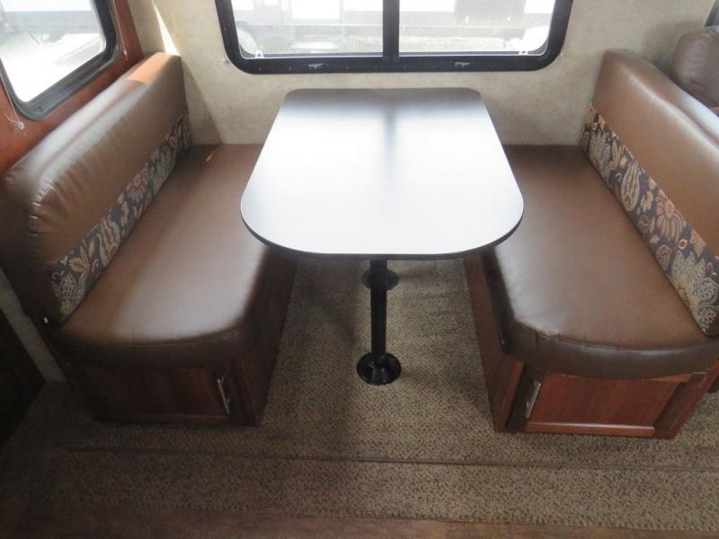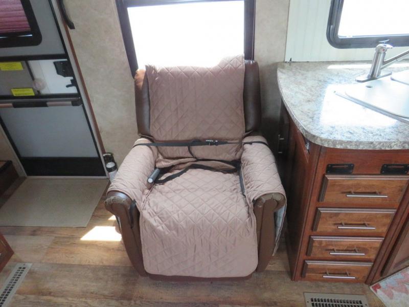 Step inside to the living area. There is an entertainment center and a large pantry along the interior wall. A hide-a-bed sofa and booth dinette slide out are straight ahead making the living and kitchen area a cozy retreat. A single recliner is across from the hide-a-bed sofa.