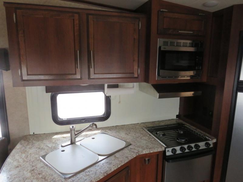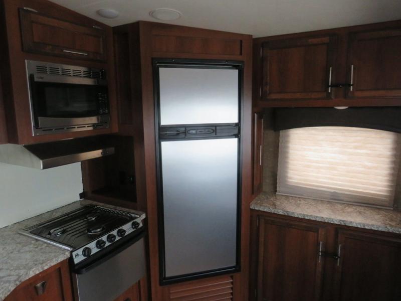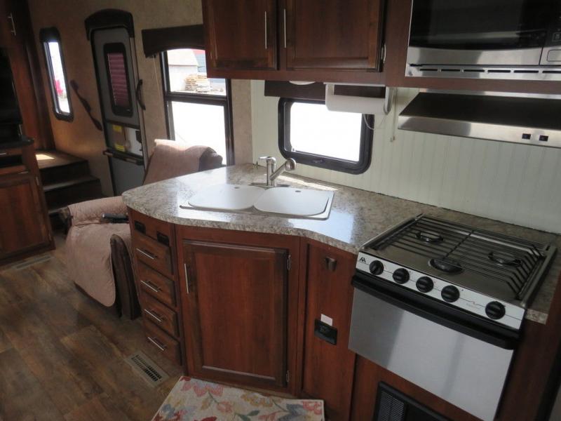 The rear kitchen in this Jayco Eagle HT 27.5RKDS fifth wheel is sure to make any cook in the family pleased with the set up.