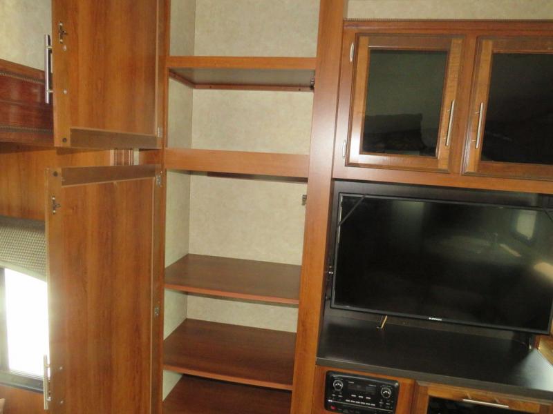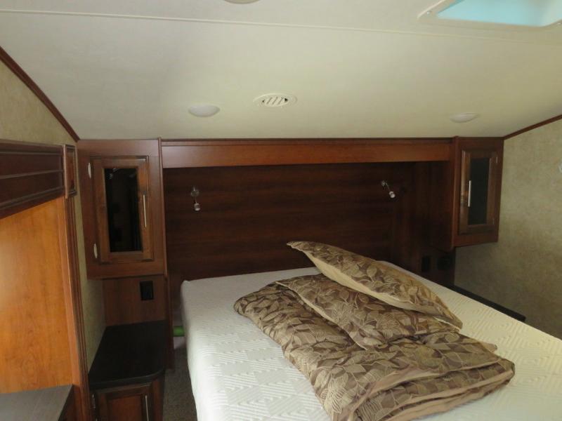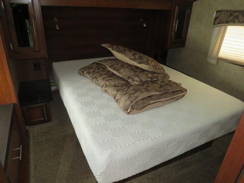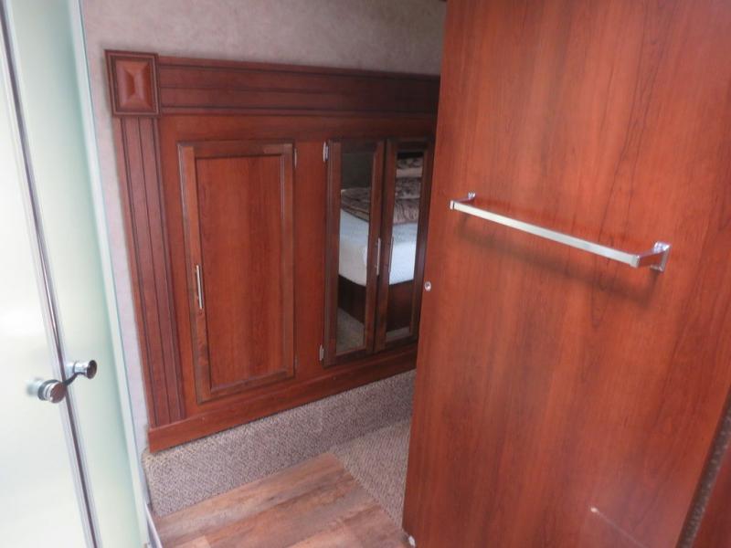 The bedroom offers a slide out with a wardrobe, dresser, and a linen cabinet. There is also a comfortable queen bed and wardrobes.