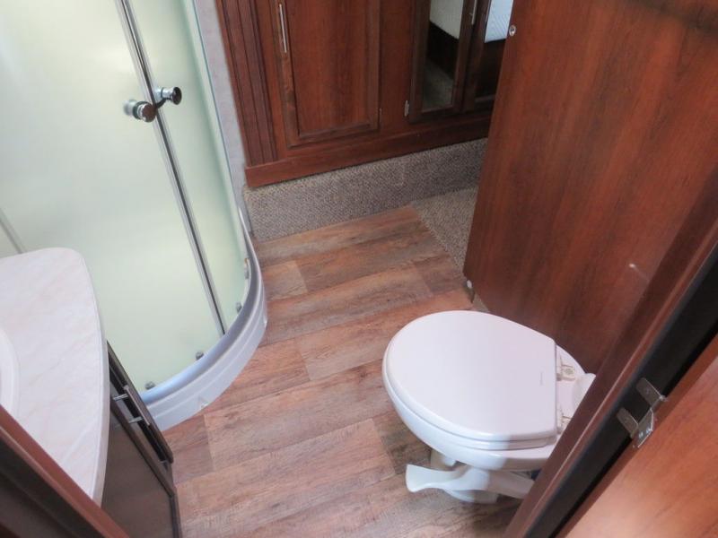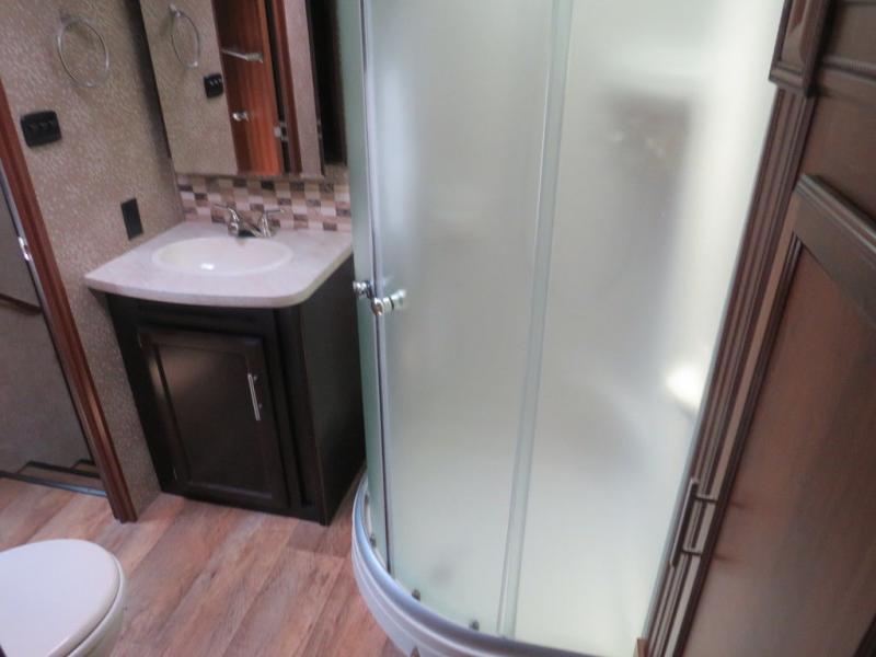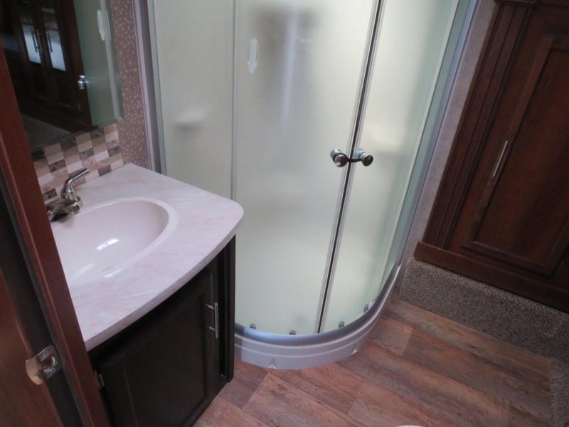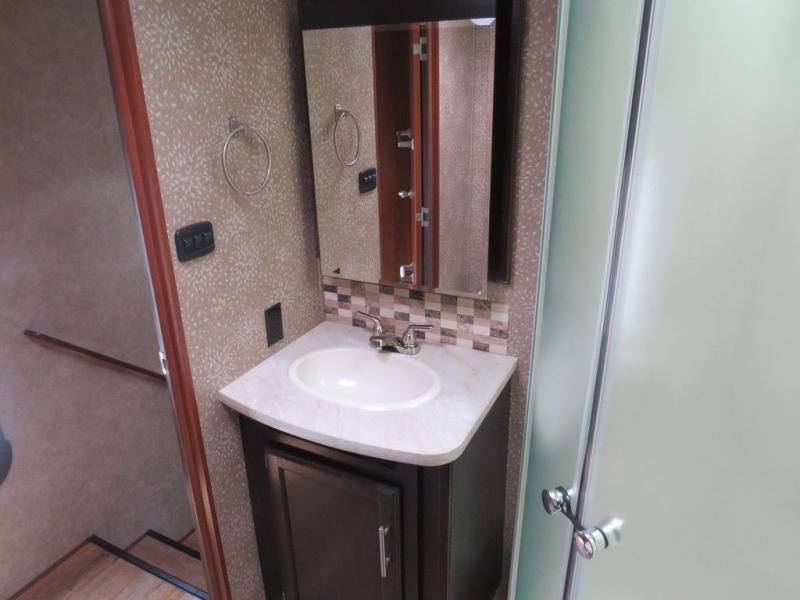 The bathroom is at the top of the front stairs on the left side. Inside the bathroom there is a sink, medicine cabinet, corner shower, toilet, and linen cabinet. The linen cabinet is part of the bedroom slide out. The bathroom has a private sliding door into the bedroom.