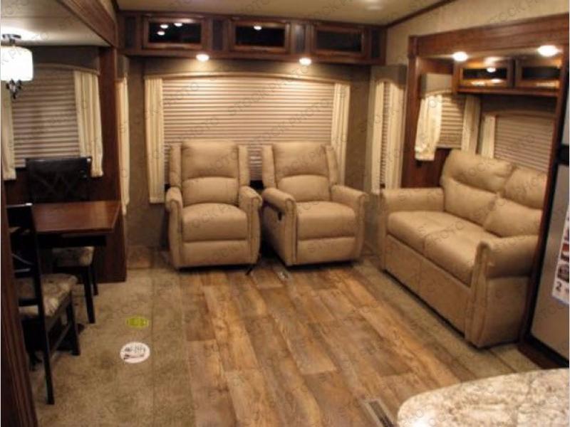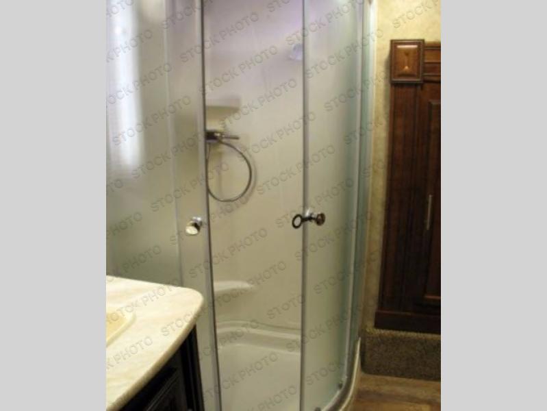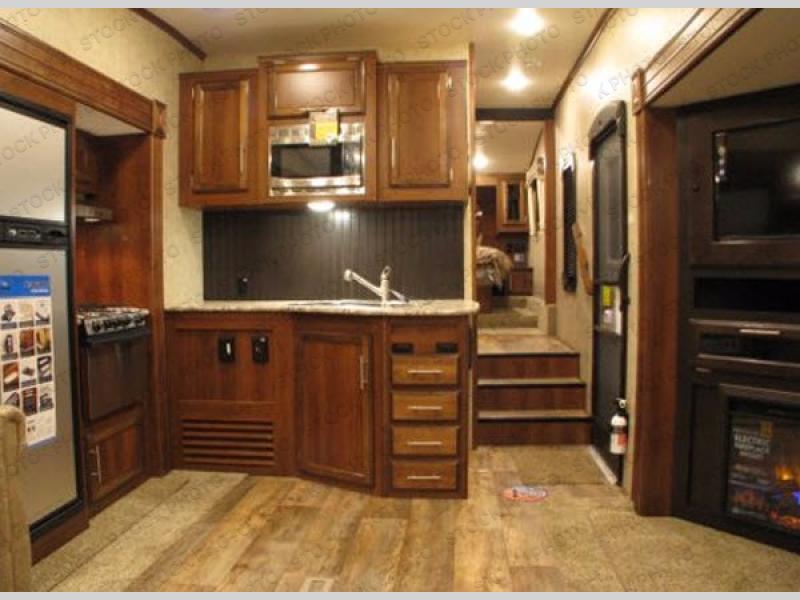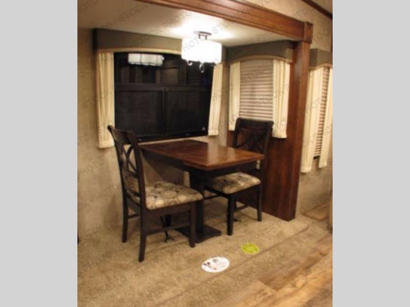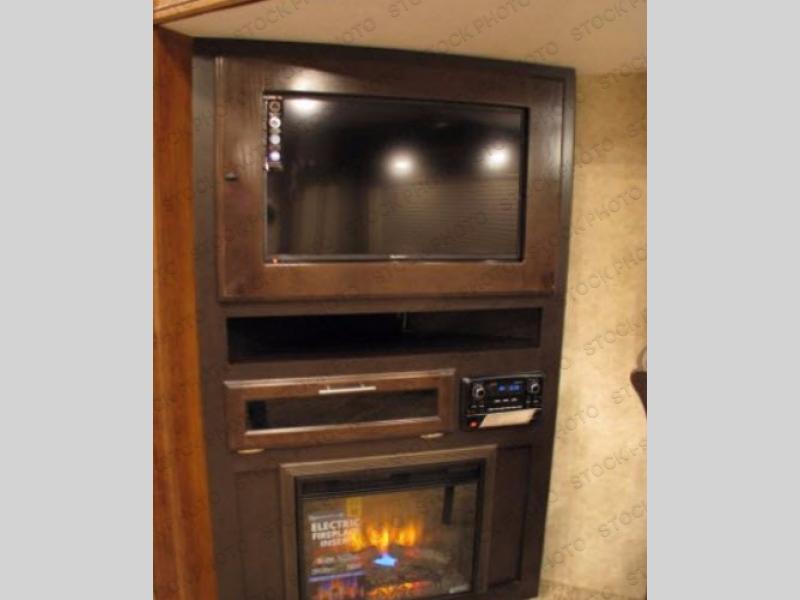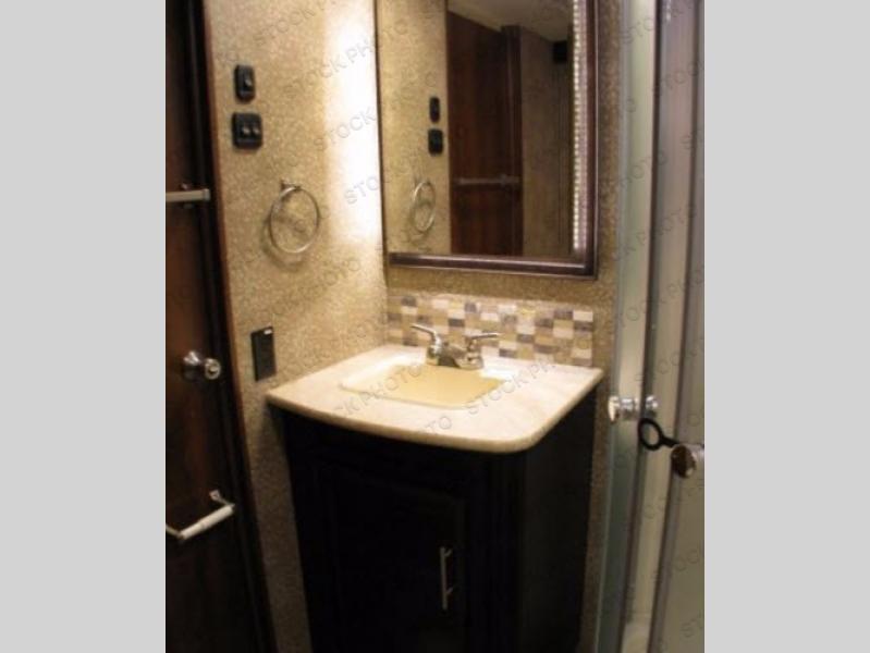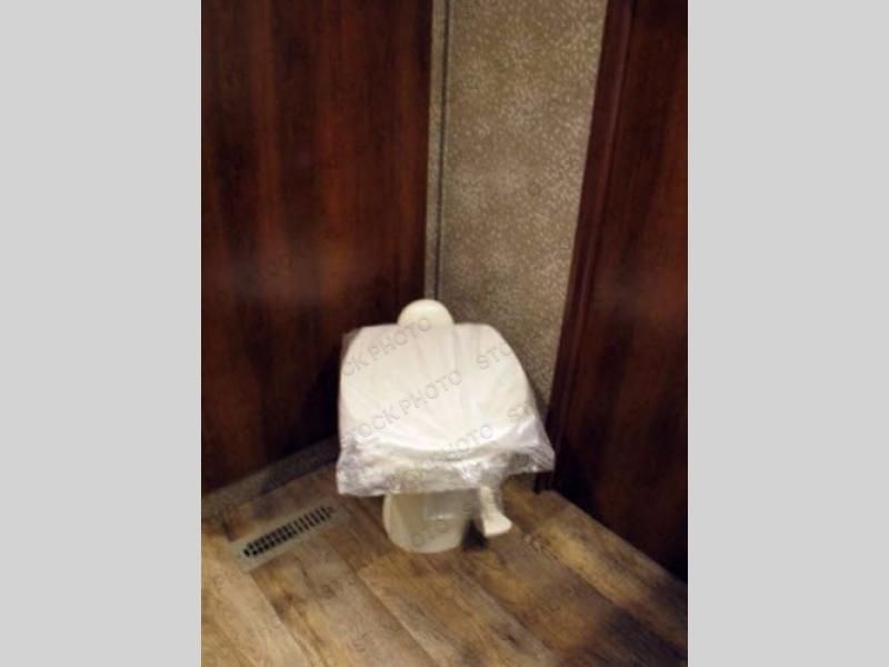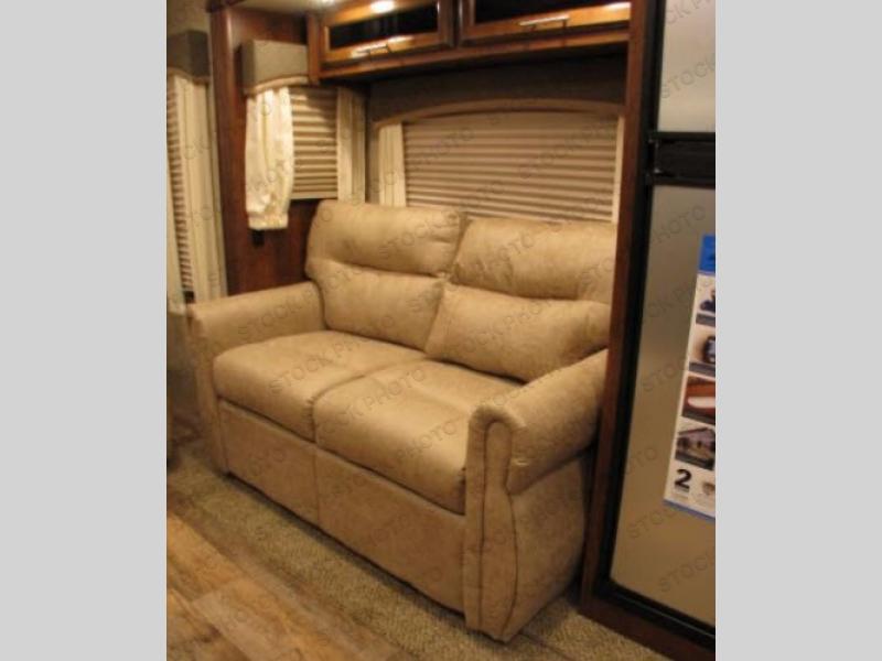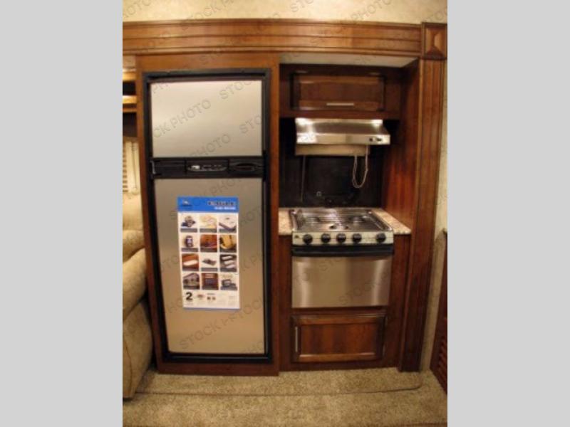 As you enter model 27.5RLTS, to the left there is a slide out with an entertainment center with an option to add a fireplace below, and a free standing table & chairs. The rear living area has two recliners. The road side slide out offers a hide-a-bed sofa, refrigerator, and a three burner range with microwave above. Along the interior wall in the kitchen/living area there is plenty of counter space, a double kitchen sink, as well as overhead cabinets for your dishes.