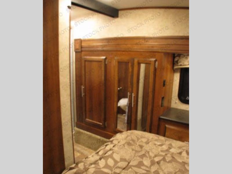 The bedroom offers a slide out with a wardrobe, dresser, and linen cabinet. There is also a comfortable queen bed and wardrobes on either side of the bed including nightstands and shelves.