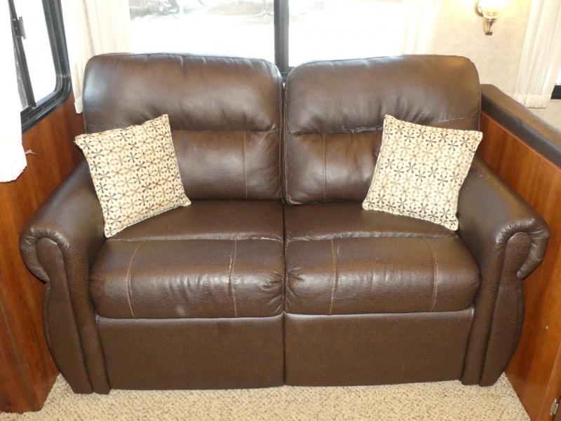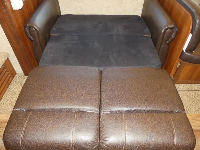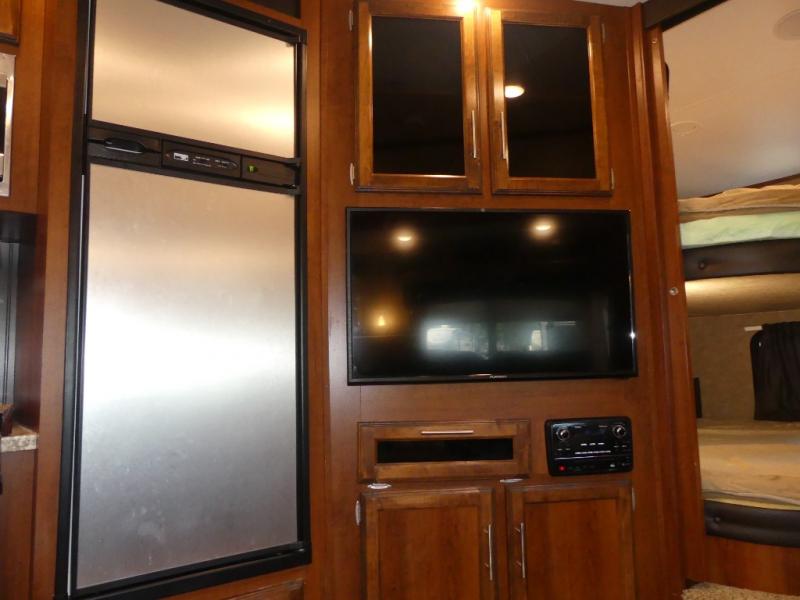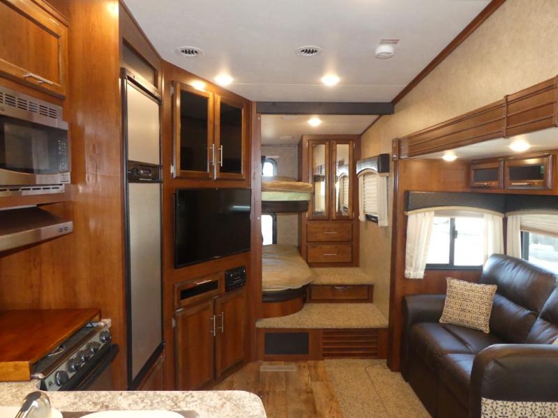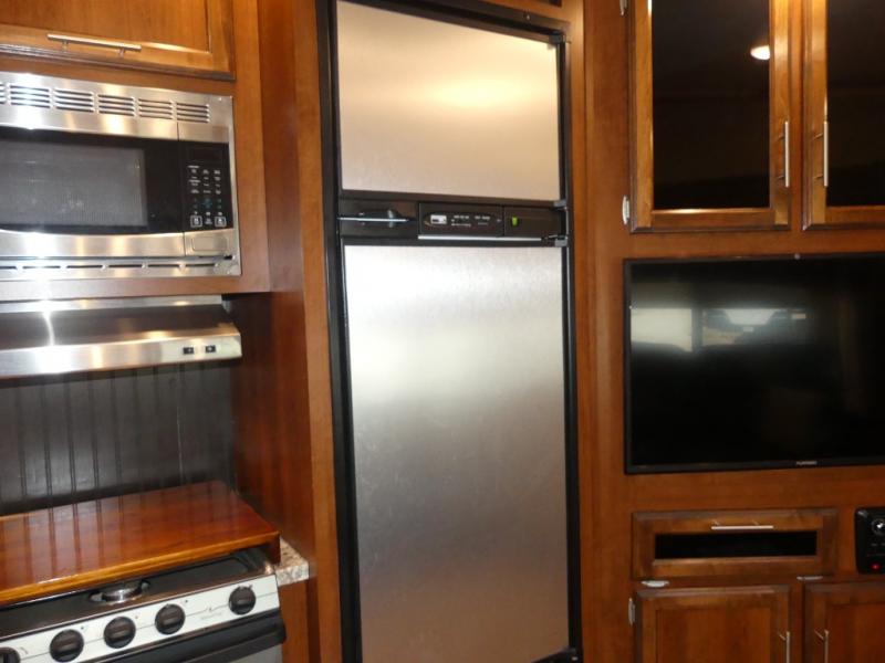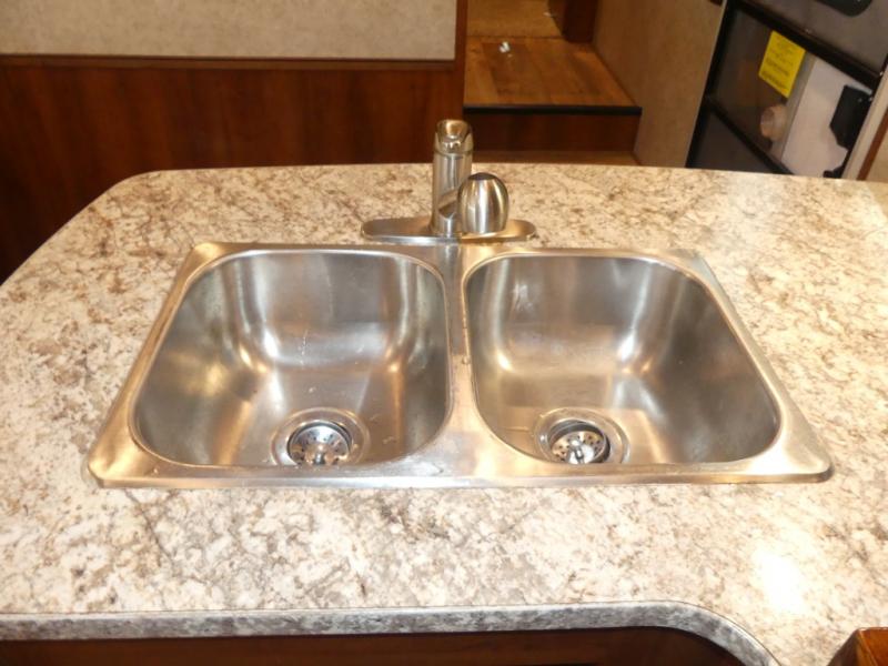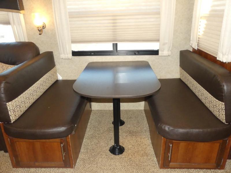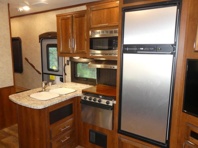 As you step inside this fifth wheel, to the left is the kitchen featuring a L-shape countertop with a double kitchen sink. Continuing along the curb side there is a three burner range, overhead microwave, refrigerator, and corner entertainment center. The opposite side of the fifth wheel has a slide with a hide-a-bed, and booth dinette.