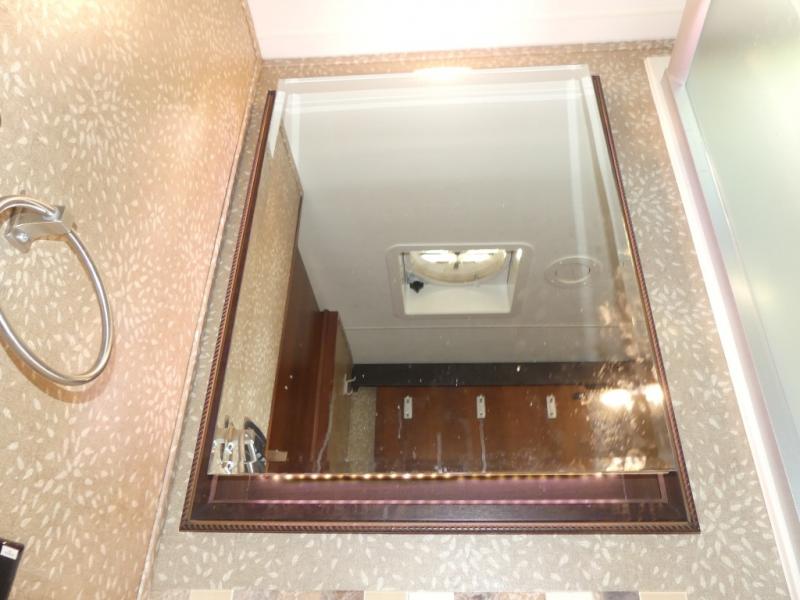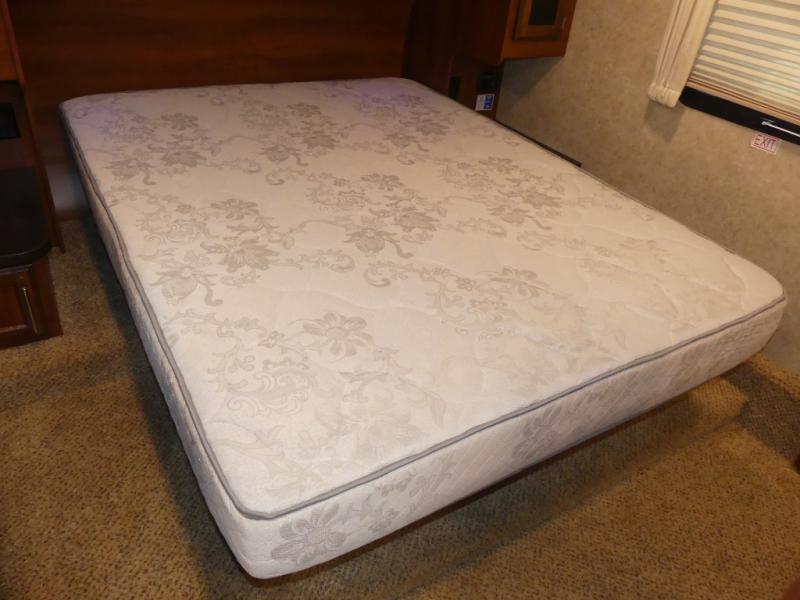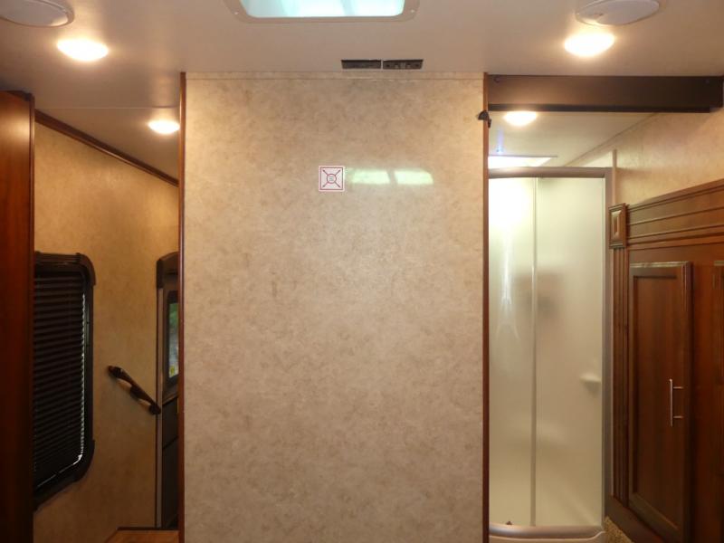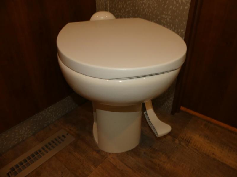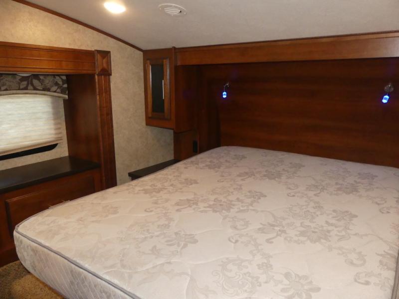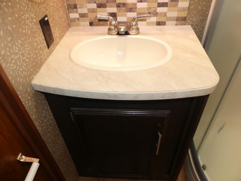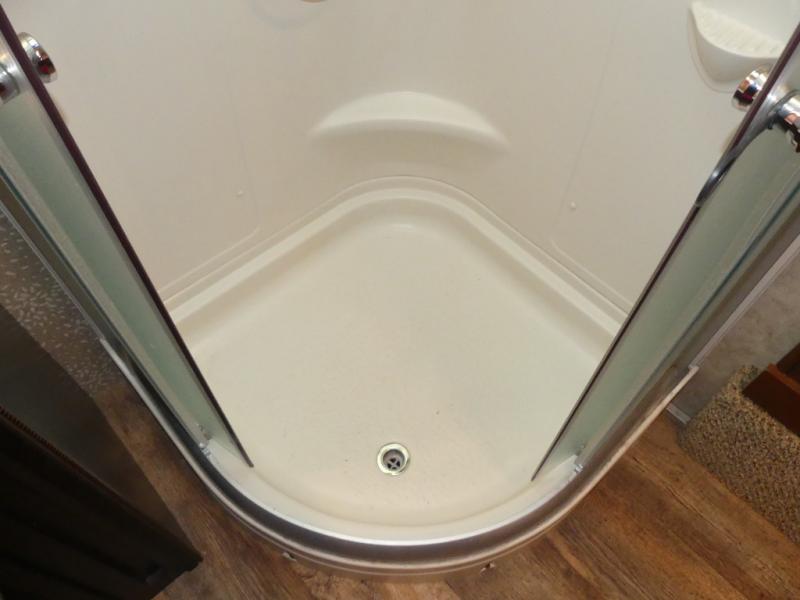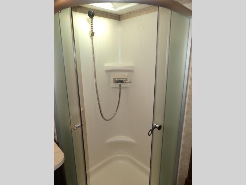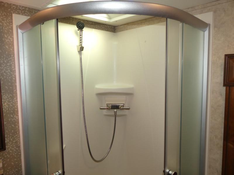 As you proceed up the stairs in the front of the fifth wheel, the bathroom is on the left side. Inside the bath you will find a sink, medicine cabinet, corner shower, toilet, and a linen cabinet which is part of the bedroom slide. There is also a private entrance into the bedroom from the bathroom.