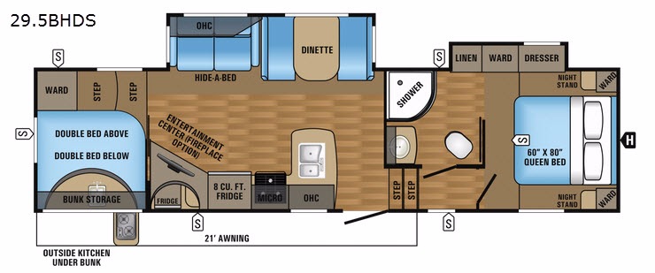 This bunkhouse Eagle HT 29.5BHDS fifth wheel by Jayco offers an outside kitchen, dual entry bath, a front bedroom, plus much more!