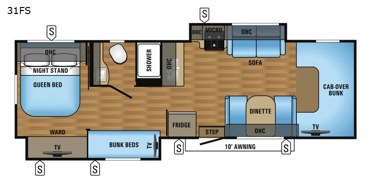 You can choose as an option, an entertainment center over the cab. You can bring all of the necessary items from home and store them in the overhead cabinets or in all of the exterior storage areas. Outside you will also enjoy the 10' awning and the shade that it provides, plus so much more!