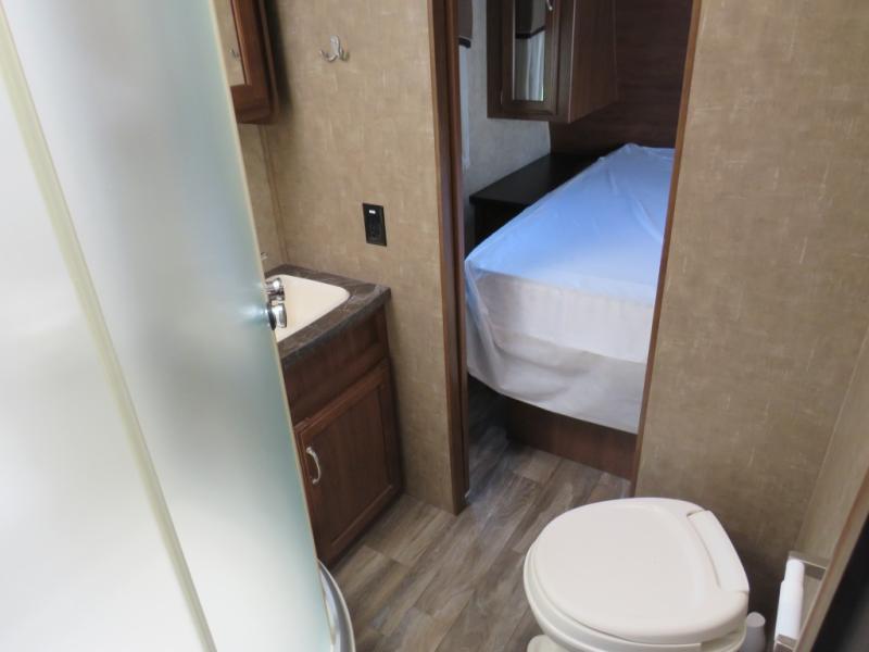 As you enter the trailer to the right a curtain separates the front bedroom from the hallway to the living/kitchen space. There is a queen bed, wardrobes on each side of the bed, and an overhead shelf. A sliding bathroom door allows direct access to the the bath from the bedroom.
