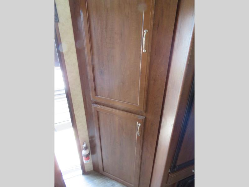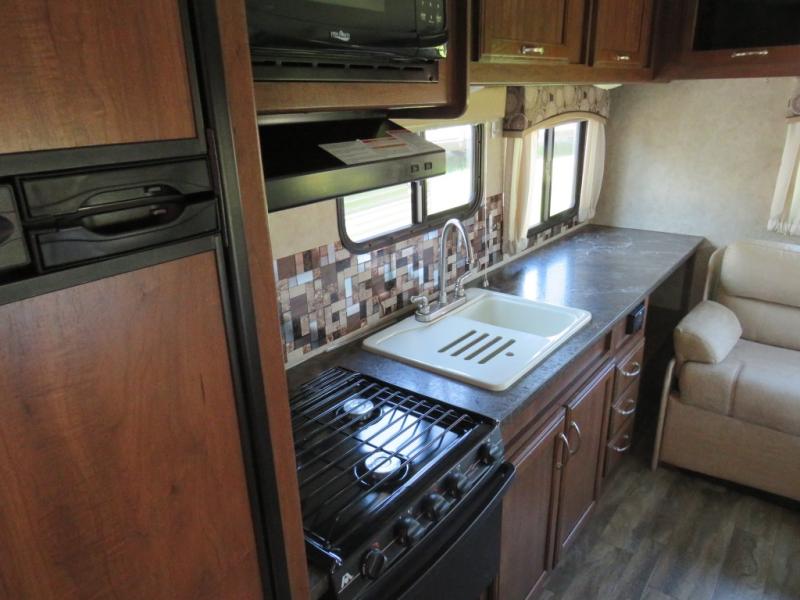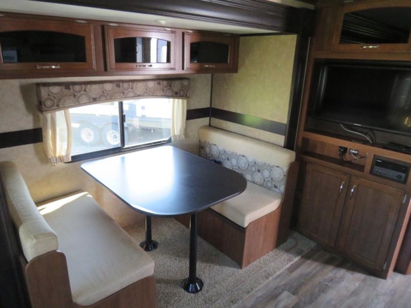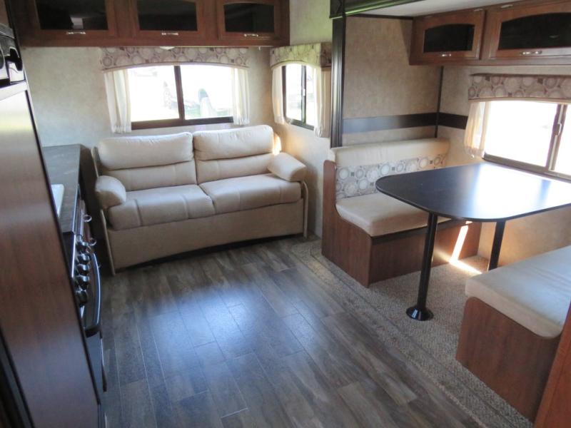 The kitchen space on the curb side includes a refrigerator, three burner range with overhead microwave oven, a large kitchen sink, and a large amount of countertop space that stretches to the rear of the trailer. There are also overhead cabinets for storing your dishes and pots and pans over the sink and countertop. The dinette slide with overhead cabinets is on the opposite side allowing more space to move around. A entertainment center is on the interior wall right next the dinette. The rear living space features a jackknife sofa with overhead storage.