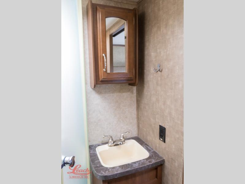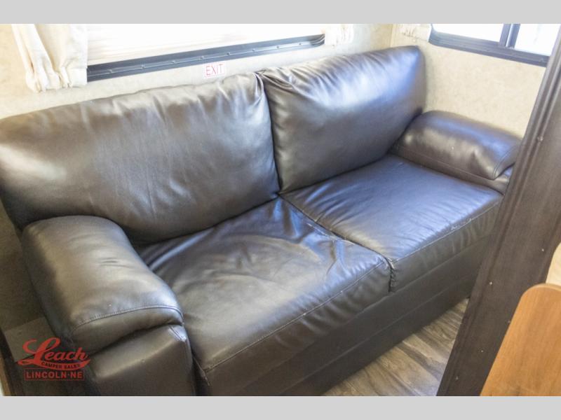 The kitchen space on the curb side includes a refrigerator, three burner range with overhead microwave oven, a large kitchen sink, and a large amount of countertop space that stretches to the rear of the trailer. There are also overhead cabinets for storing your dishes and pots and pans over the sink and countertop. The dinette slide with overhead cabinets is on the opposite side allowing more space to move around. A entertainment center is on the interior wall right next the dinette. The rear living space features a jackknife sofa with overhead storage.