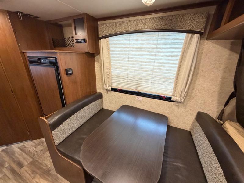 Along the opposite side of the expandable you will find a dinette and a refrigerator with overhead storage.