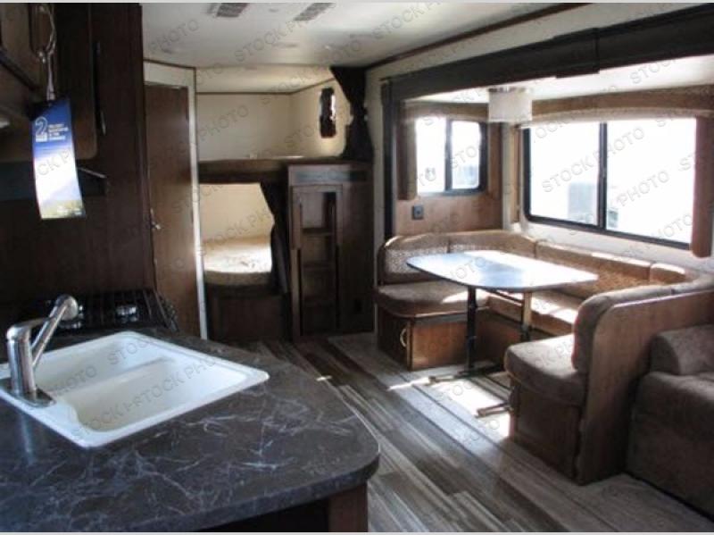 The rear of the travel trailer offers a set of double bunk beds, which is perfect for your kids.