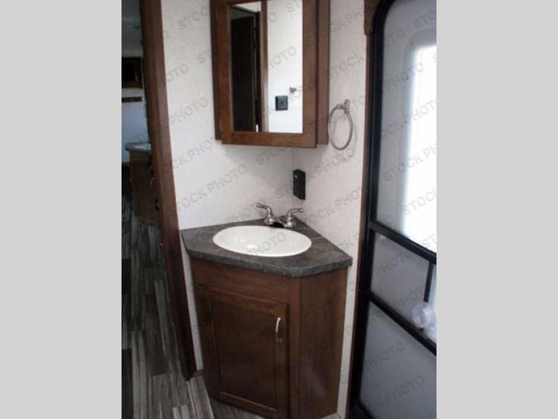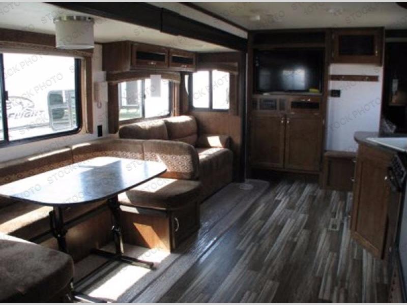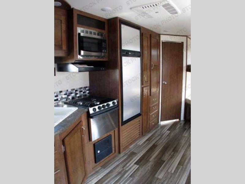 The living and kitchen areas offer a slide with a u-dinette and sofa. Along the interior wall you will find an entertainment center and a bench with storage. There is also a double kitchen sink, three burner range, microwave, refrigerator, and pantry along the curb side wall.