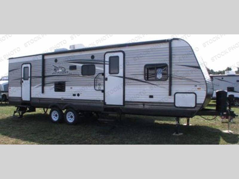 Rear double bunks and a single slide, plus two entry doors is what you will find inside this 28BHBE Jay Flight.