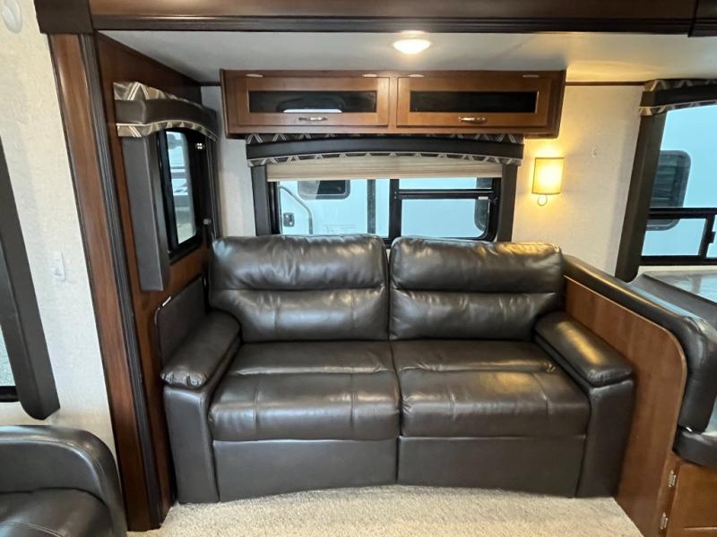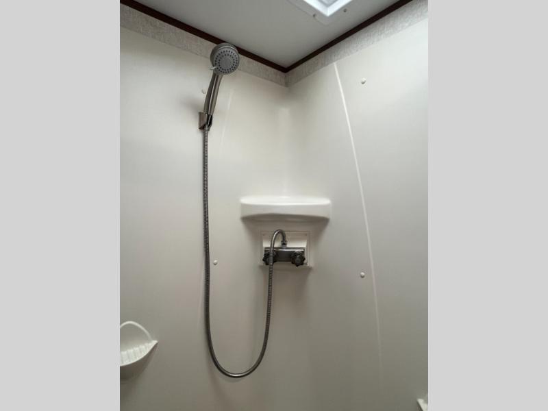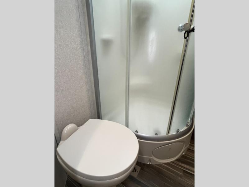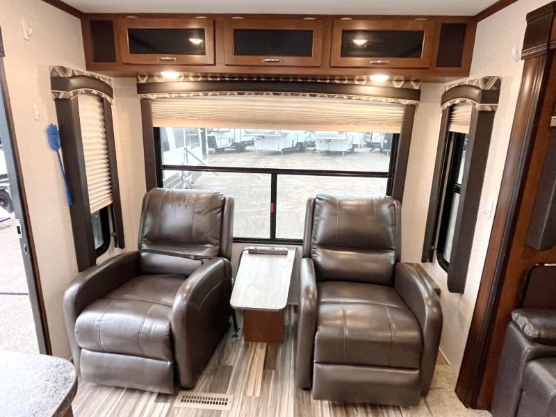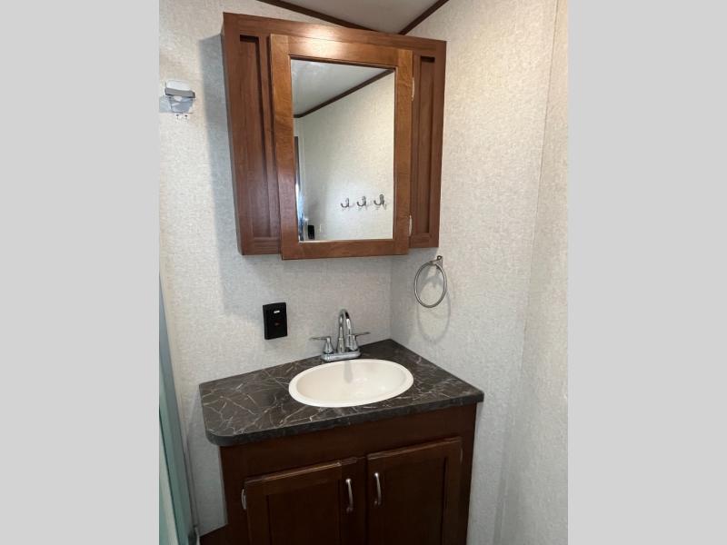 As you enter the main entrance to your left along the rear wall you will find two lounge chairs and an end table. The road side slide has a sofa and a dinette or you can choose an optional hide-a-bed sofa and a free-standing table and chairs. Along the opposite side of the trailer you will find a double kitchen sink, three burner range, microwave, refrigerator, and a pantry. Adjacent to the pantry, along the interior wall is where you will find the entertainment center.