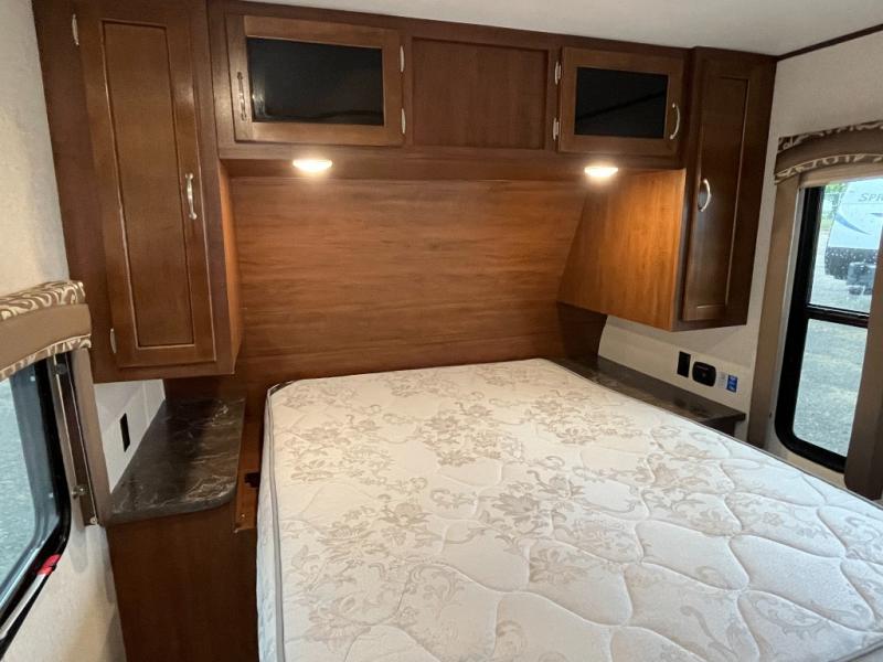 Overhead cabinets can be found throughout the trailer, and outside there is exterior storage for all of your outdoor camping gear, and more!