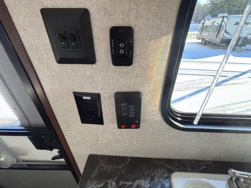 Located in the rear of the trailer you will find a sofa with an overhead cabinet and a dinette with an overhead cabinet.