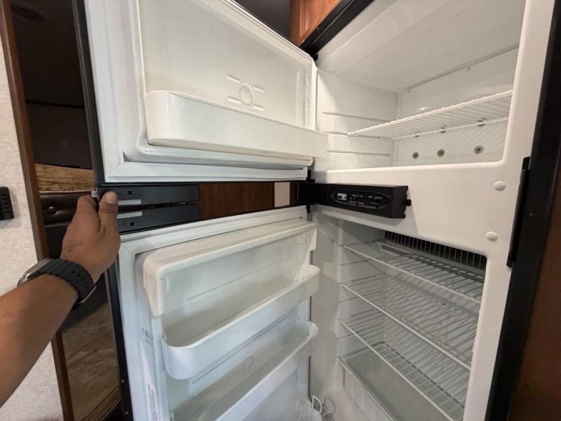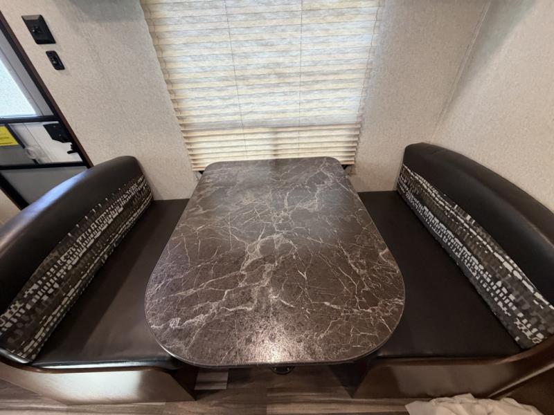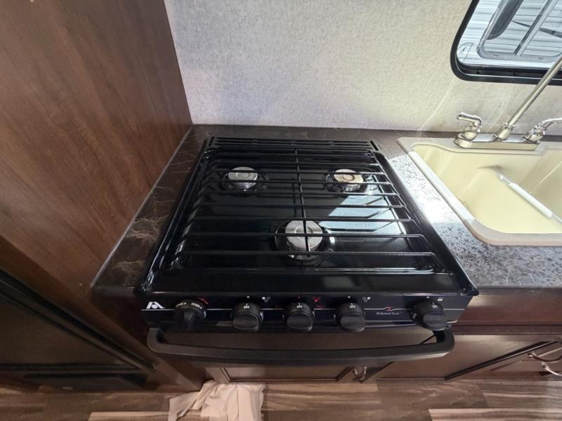 As you enter the travel trailer, to the left there is a dinette. Across from the dinette you will see a refrigerator, three burner range, microwave, and double kitchen sink. There is also a nice sofa in the main living area.
