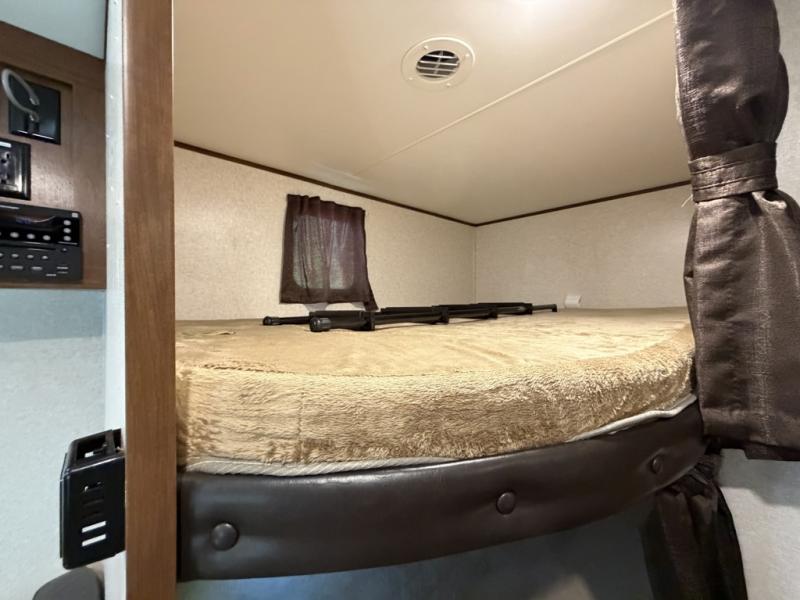 As you proceed toward the rear of the trailer, you will find a set of double bunk beds in the left corner of the travel trailer. With the double bunks you can sleep four people in this area!