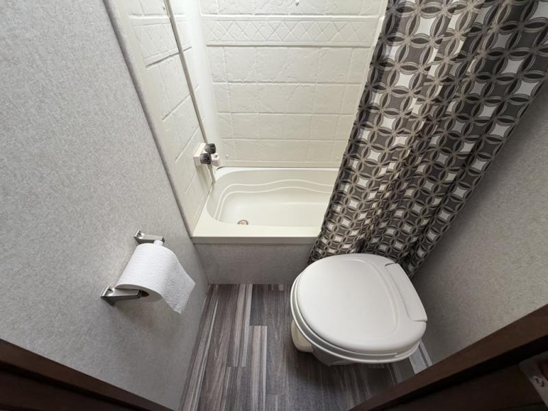 The bathroom is located in the right rear corner of the trailer. In the bathroom there is a tub/shower and toilet. Just outside of the bathroom area there is a sink.