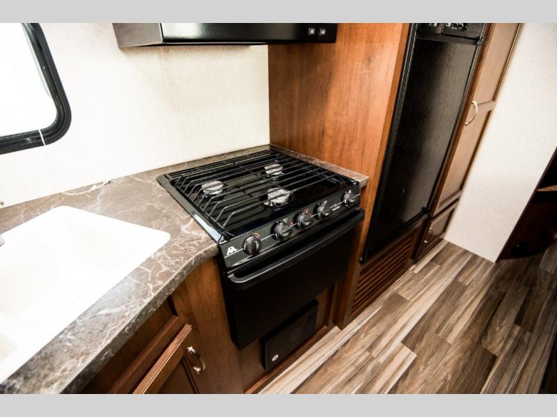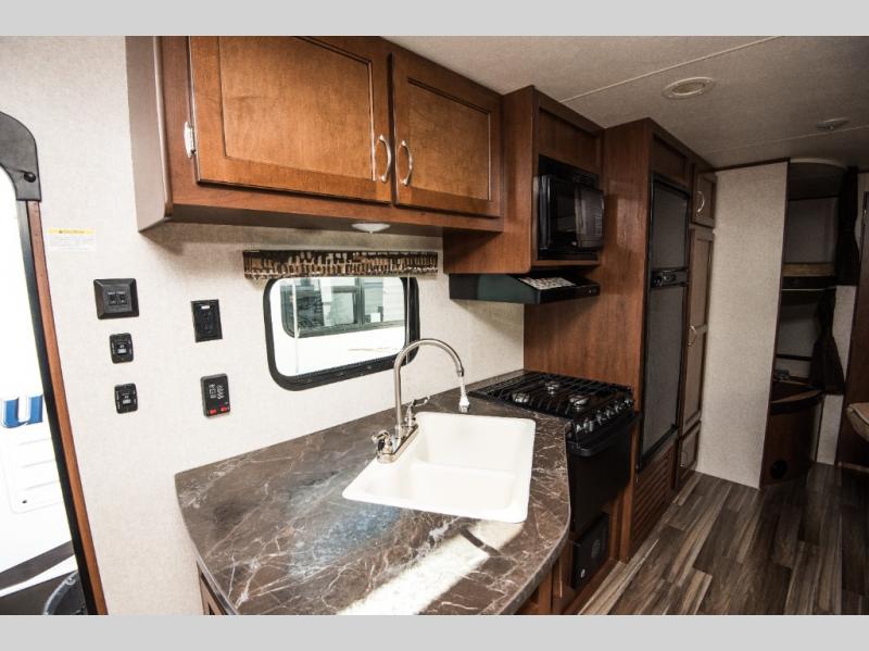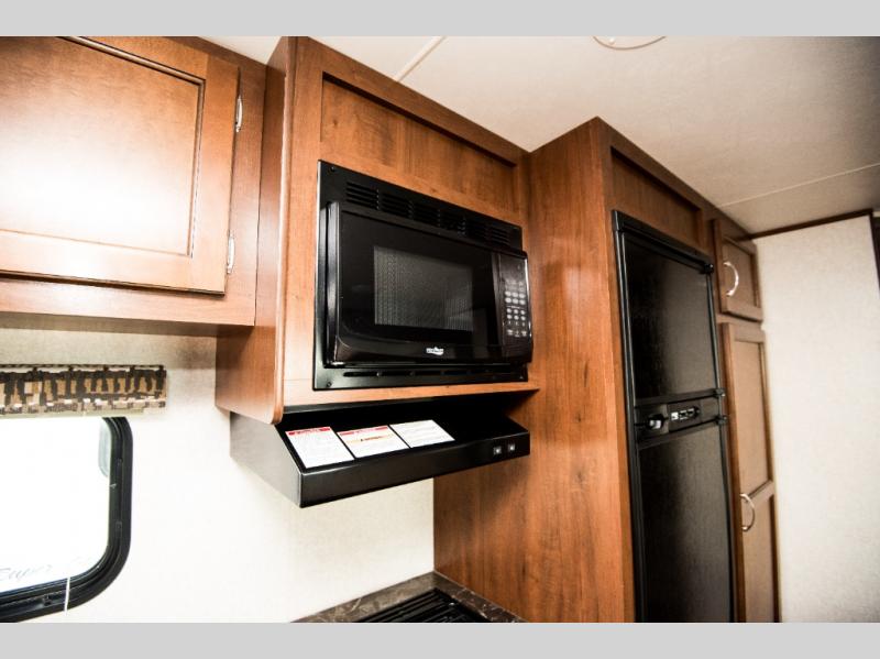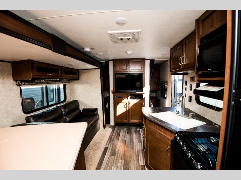 Stepping inside the travel trailer, to the left you will find a double kitchen sink, three burner range, microwave, refrigerator and large pantry. You will also notice how open and spacious the kitchen and living area are since there is a slide. The opposite side of the trailer features a slide with a dinette, sofa, and overhead cabinet above the sofa. Along the front of the living area you will see a large entertainment center.