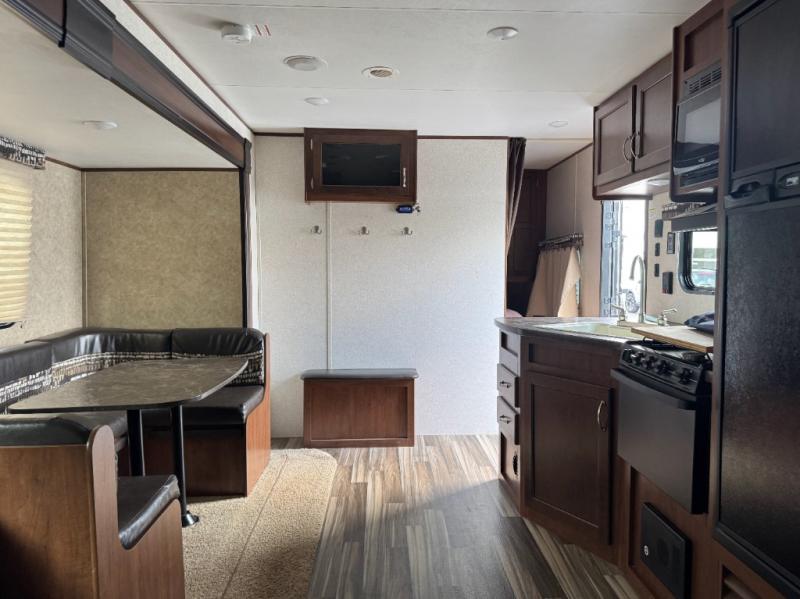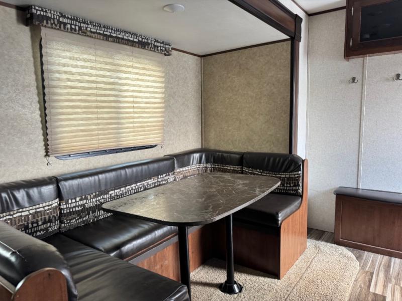 Along the door side of this model is where you will find the kitchen appliances such as an angled double sink, overhead cabinets, microwave, three burner range, and a refrigerator. Continuing along this wall there is an entertainment center where you can watch your favorite movies or shows, and a wardrobe for your hanging clothes. Along the opposite side of the trailer there is a slide out with a u-dinette and a sofa. Both of these offer great seating options during the day, and at night you can convert the sofa and dinette into additional sleeping space. Adjacent to the slide out is a bench/storage and an overhead cabinet.