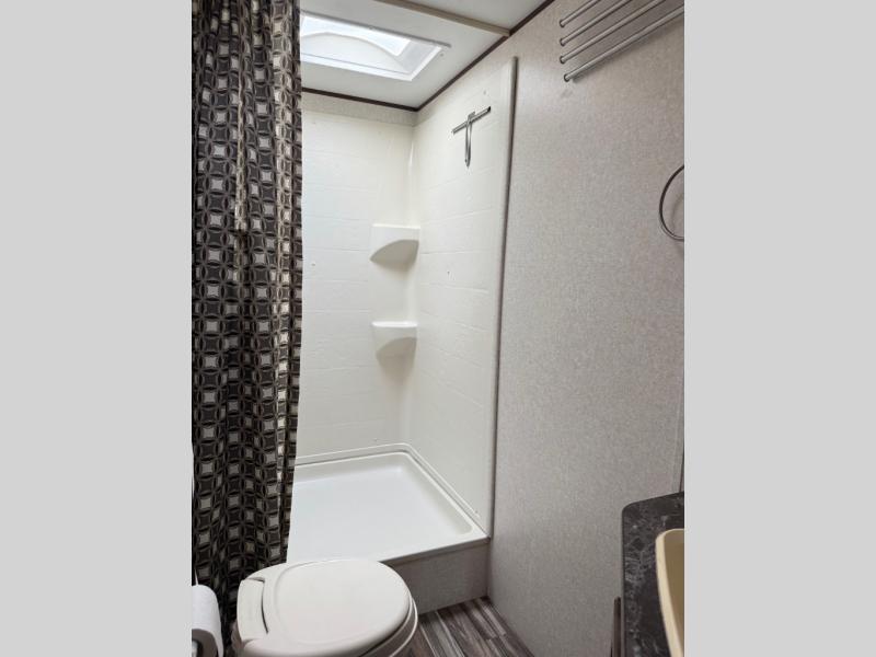 Heading toward the rear, and you will come to the bathroom. Here you can easily get ready for your day of adventure. You will find that the bathroom has a sink, toilet, and a tub/shower.