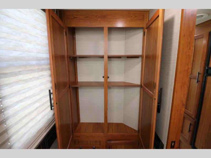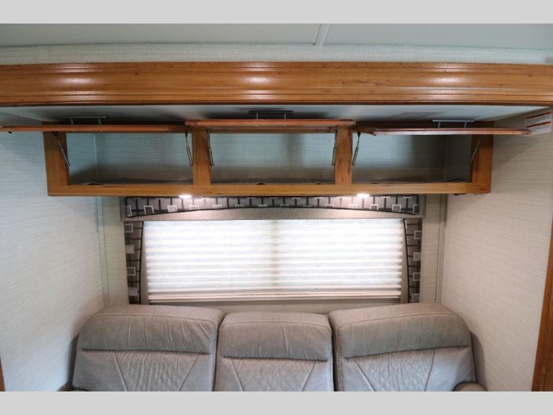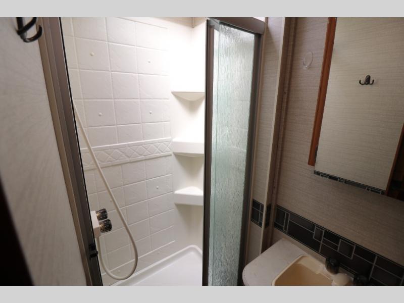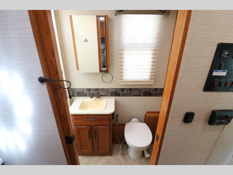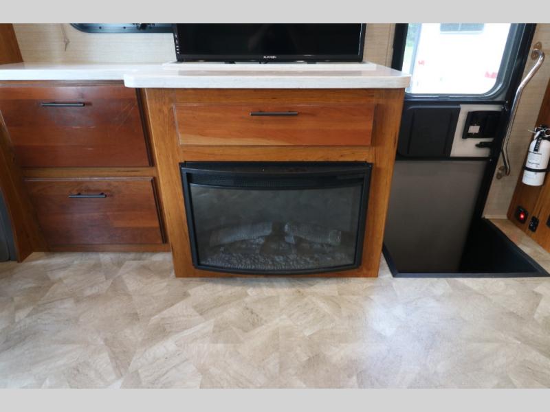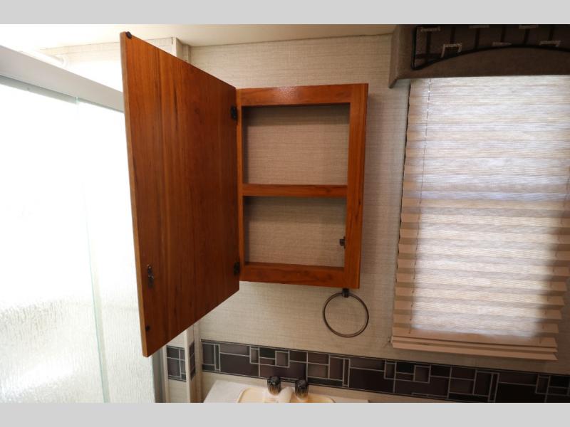Straight in from the entry door there is a slide out with a sofa and an overhead cabinet. To the right of the entry door there is a 32" TV lift, a dresser, and an overhead cabinet. Your kids can share the cab-over bunk, or maybe you have a grandchild or two that you want to take camping.