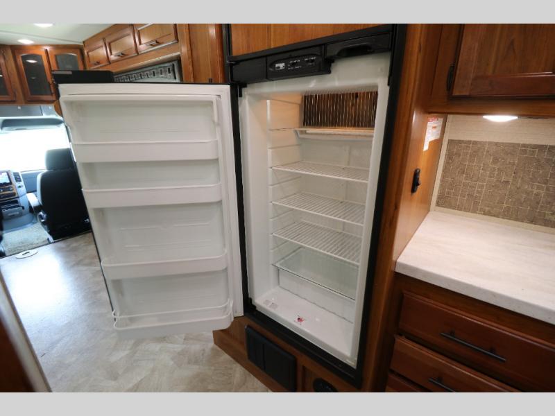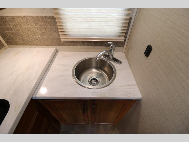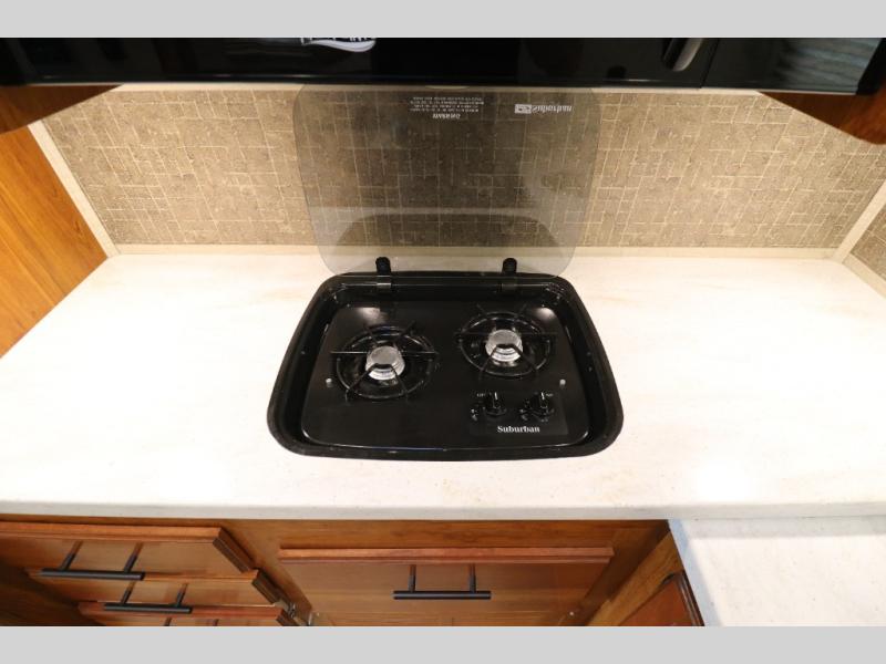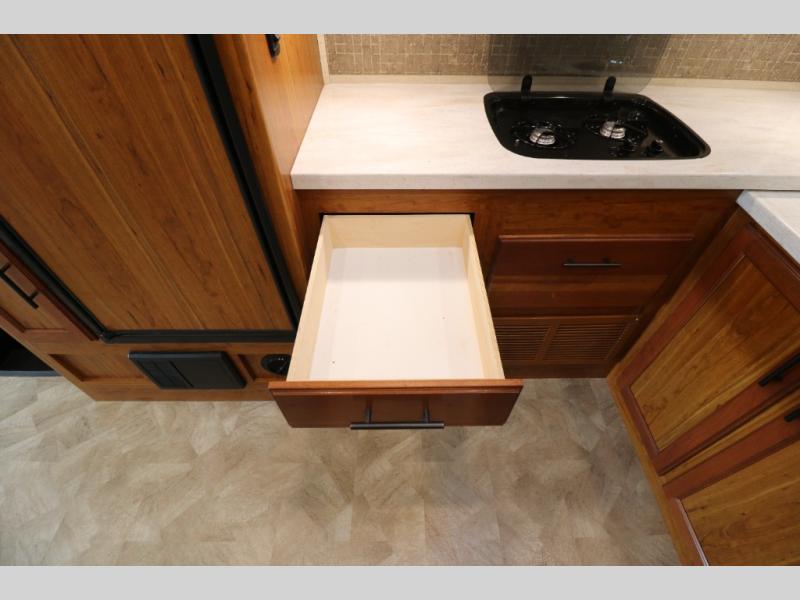 The kitchen area is located along the door side toward the rear of this model. To the left of the entry door there is a pantry, 8 cu. ft. refrigerator, a two burner range, microwave, and a single sink, as well as extra counter space.
