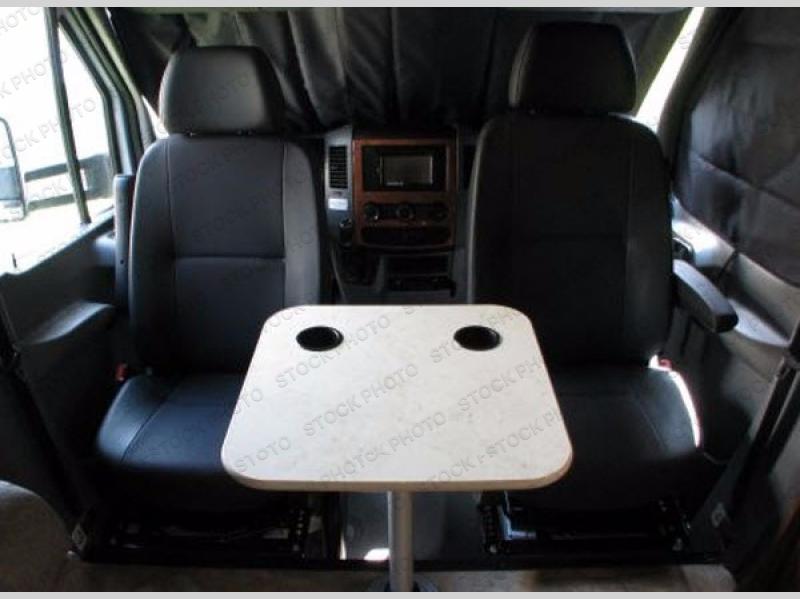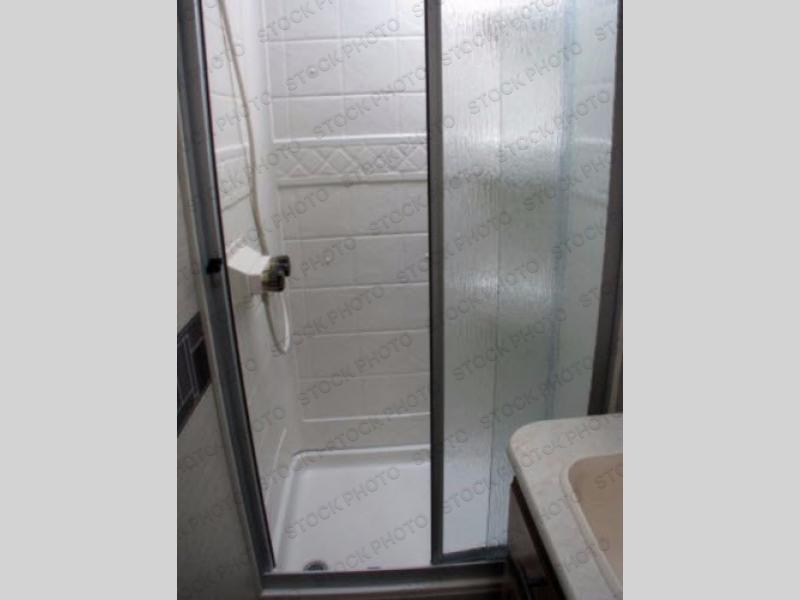 The kitchen area is located along the door side toward the rear of this model. To the left of the entry door there is a pantry, 8 cu. ft. refrigerator, a two burner range, microwave, and a single sink, as well as extra counter space.