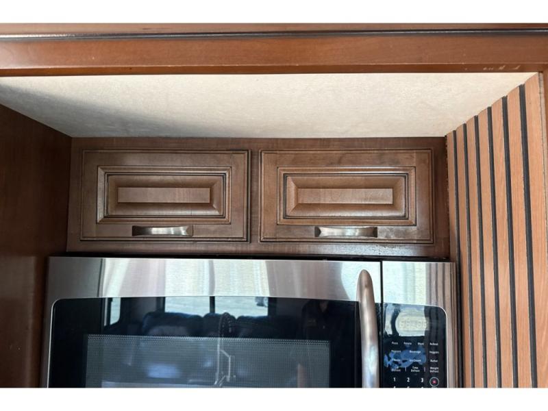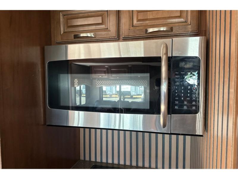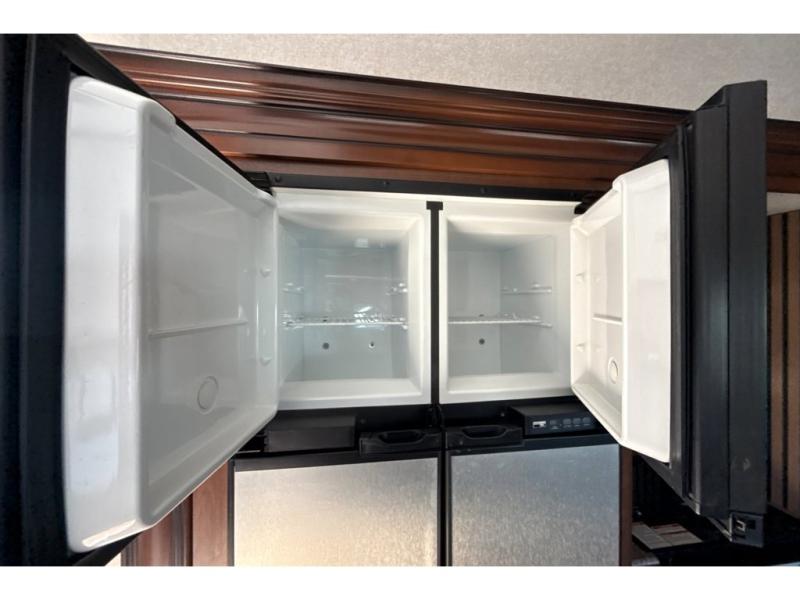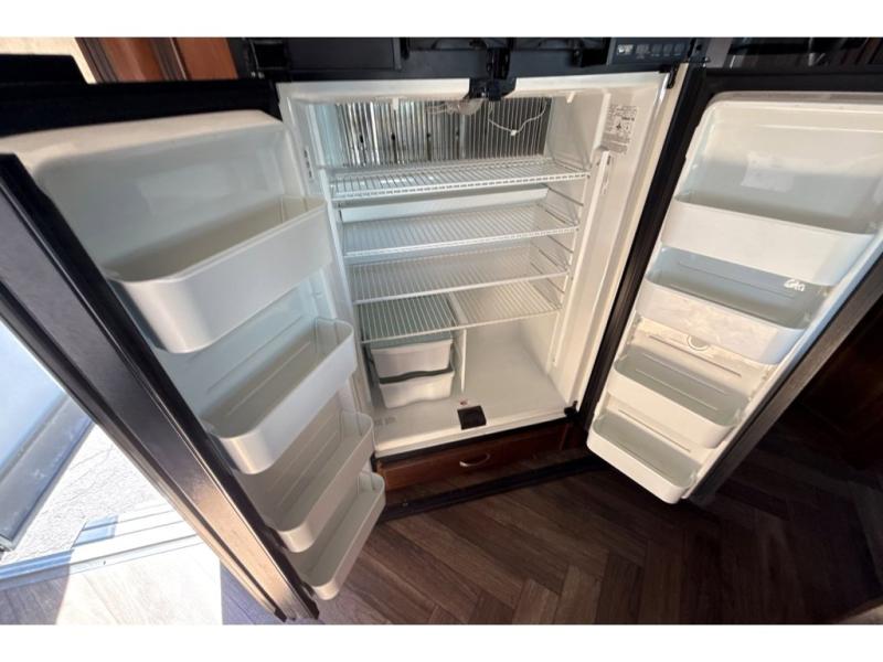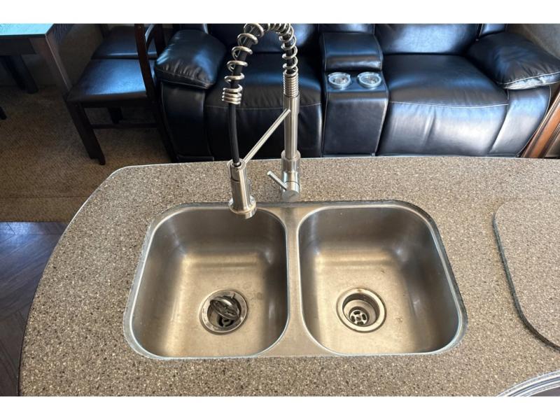 Along the curb side, you will notice the slide out 12 cu. ft. refrigerator and three burner range with overhead microwave oven. You can choose an optional residential refrigerator if you like. There is a kitchen island that features added counter prep space, plus a double sink. A convenient food pantry is located just off the kitchen slide next to the entertainment center.