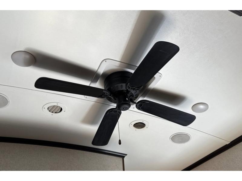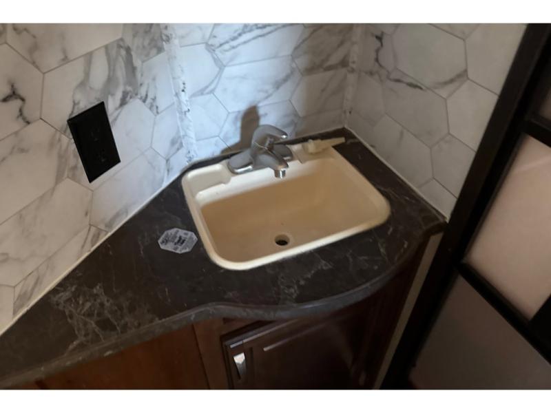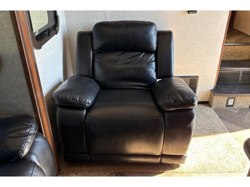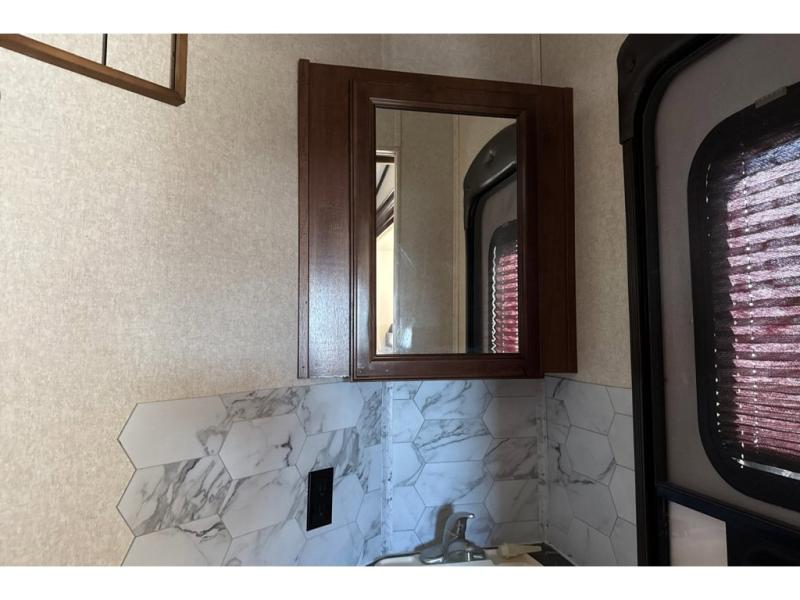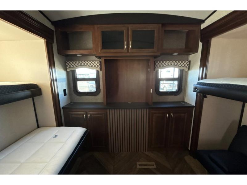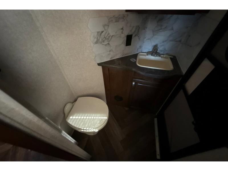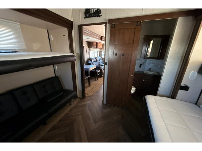 Head to the rear of this unit and check out the private bunkhouse including a half bath with a second entry door into the fifth wheel. You will see a full wall of storage along the rear wall, and dual slide outs creating added floor space. The road side features a slide out that includes game chairs that the kids will love and a fold up bunk above. You can also choose a fold up top bunk with a lower bunk in place of the game chairs, and a trundle for a third bunk on that side. Or, a hide-a-bed with flip-up top bunk, the choice is all yours! The curb side features a fold up bottom bunk and top bunk slide with exterior kitchen accessible from the outside. The half bath includes a toilet and sink, plus the second entry door mentioned above.