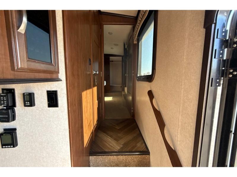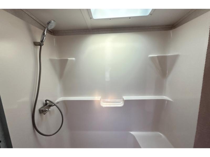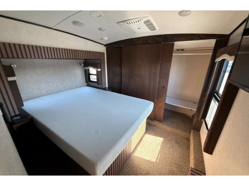 The front master offers a relaxing space with queen slide out bed including shelves on both sides of the bed, plus a set of shelves along the outer bathroom wall. There is a chest of drawers with a TV above opposite the bed. A walk-in closet provides ample space for clothing, and a corner storage closet has been prepped for a washer and dryer if you choose to add.