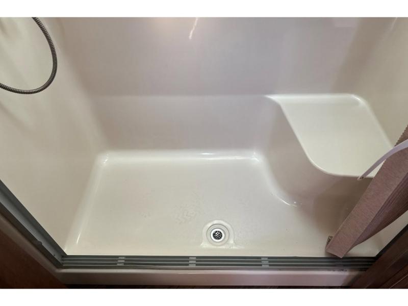 Enter and notice the two recliners along the interior wall with overhead cabinets above. Adjacent you will find more seating with a slide out bi-fold hide-a-bed and booth dinette. You may even decide to choose the optional table and chairs in place of the dinette. There is an entertainment center with TV and fireplace along the angled interior wall.