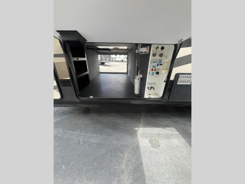 The bedroom has a king bed slide out with shelves or you can choose an optional queen with chests on either side of the bed. Enjoy the storage underneath the bed, plus all of the room in the walk-in closet. In the corner of the room there is an area that has been prepped for a washer/dryer, and across from the bed there is a chest with a TV.