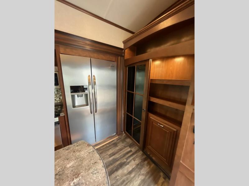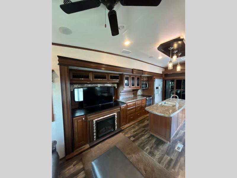 As you enter the fifth wheel, to the left there is a slide out with a free-standing table and theater seating or you can choose optional recliners. Along the rear wall you will enjoy a tri-fold hide-a-bed or choose an optional reclining sofa. The slide out along the road side has an entertainment center with fireplace below, cabinets, microwave, three burner range, and a residential refrigerator. There is a kitchen island with lots of counter space and a double kitchen sink. On the interior wall of the kitchen there is a large pantry with sliding doors and a wardrobe.