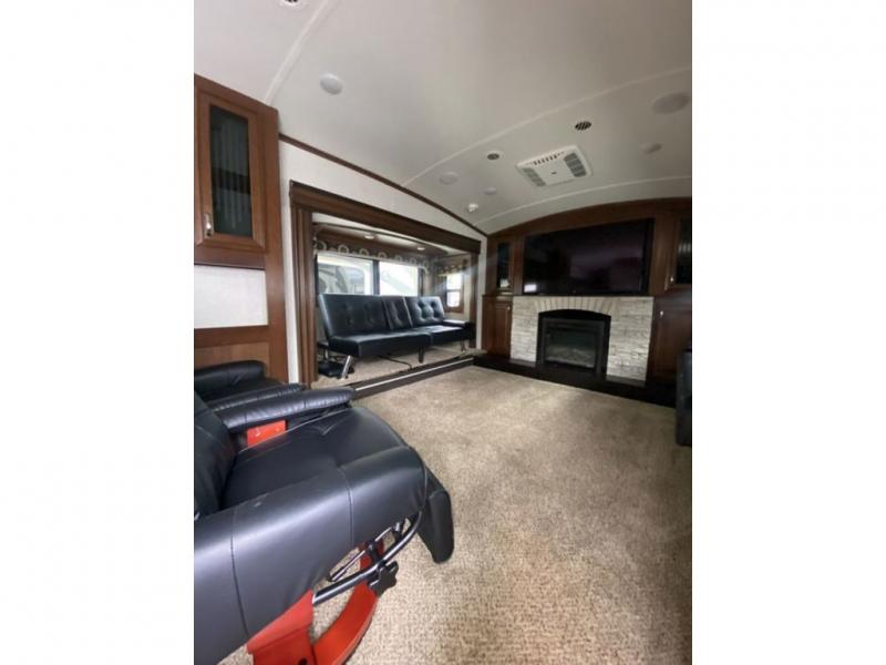 Looking for lots of space? Then you will find it inside this FIVE slide Jayco Pinnacle 38FLSA fifth wheel with dual entries, plus a full wall entertainment center with a TV and Ledgestone surround fireplace.