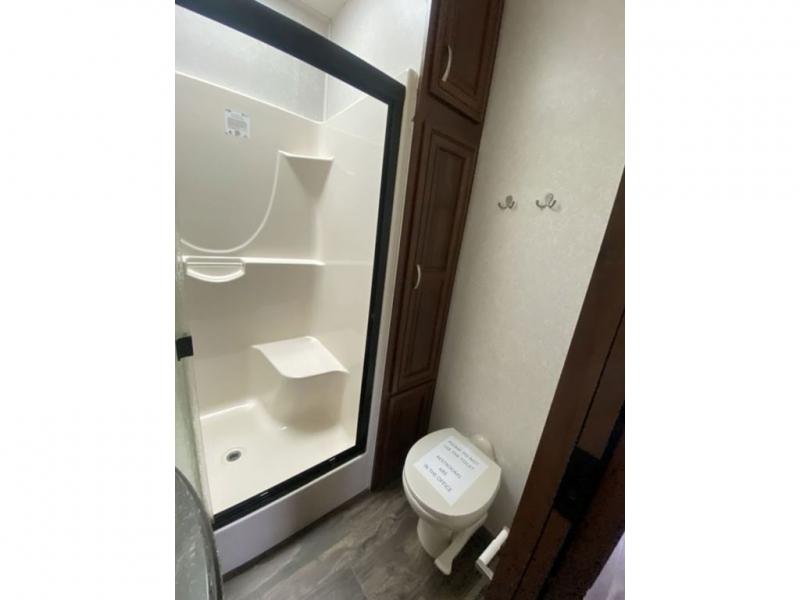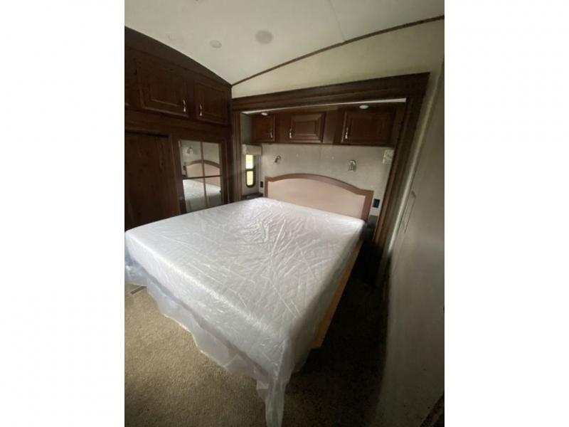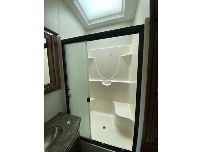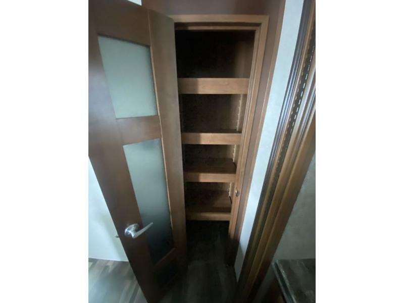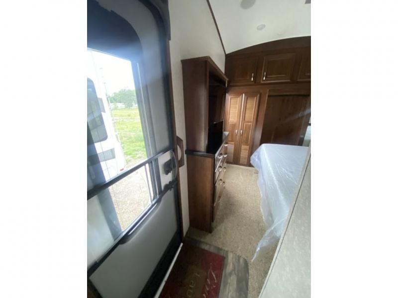 In the rear bedroom there is a king bed slide with shelves and overhead cabinets or you can choose an optional queen with chest storage on either side, a walk-in closet, and a chest with a TV above the chest. In the corner of the room you will find that it has been prepped for a washer and dryer. The second entrance/exit to the fifth wheel is in the bedroom.