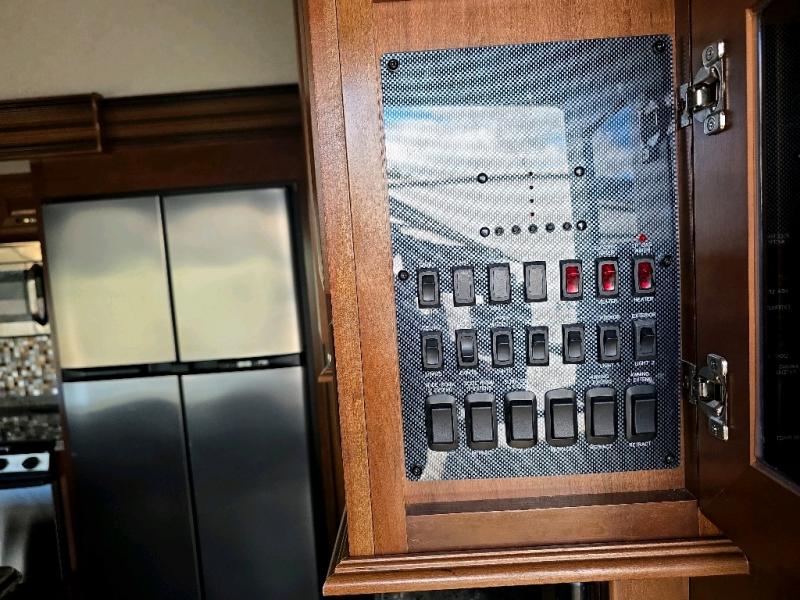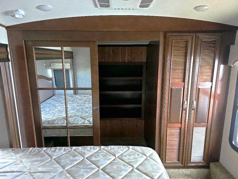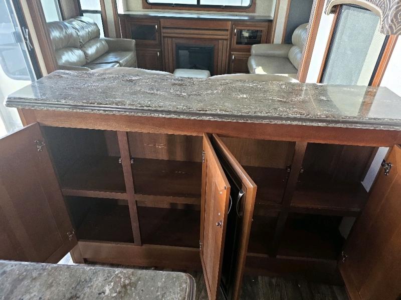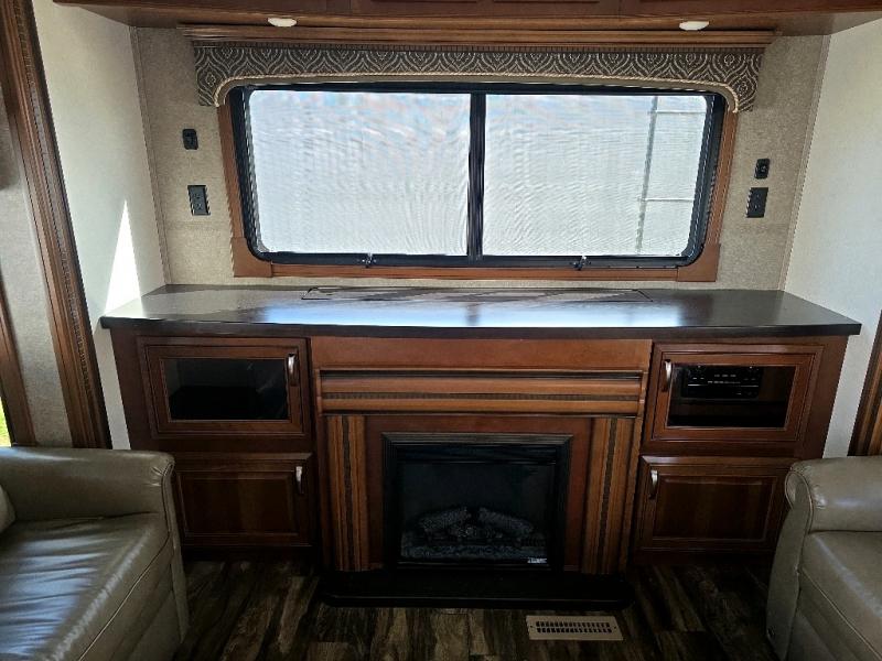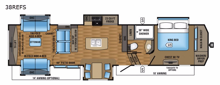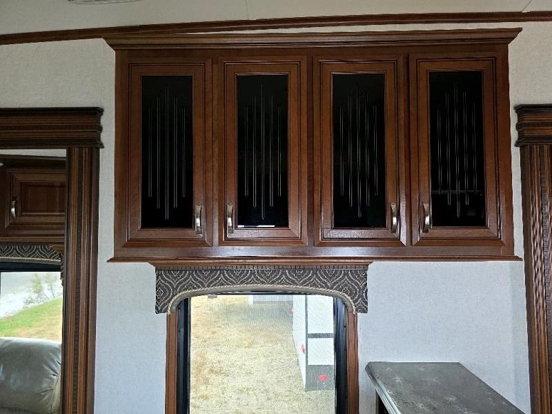 Start out by entering the rear most side 60" glass patio door. This leads to the rear living area where your family and friends will enjoy hanging out. Here you will find dual opposing slide out hide-a-bed sofas. One is a bi-fold, the other a tri-fold. There is also a theater sofa along the interior of this room plus an ottoman, so come on in and put your feet up. Along the rear wall find a full entertainment center with fireplace below. The TV lifts up when viewing and can easily glide down out of site when not in use. You will also love all of the overhead storage throughout the space.