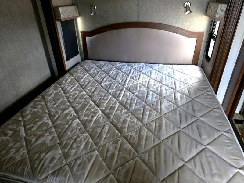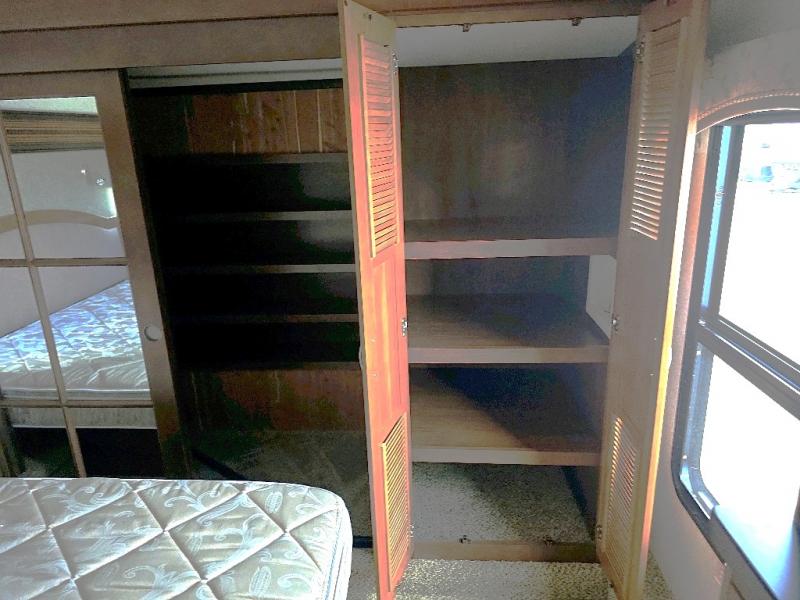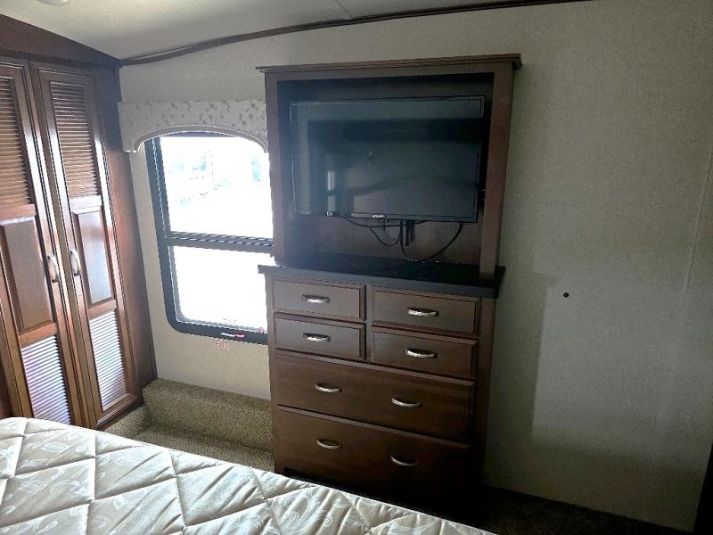 Lastly, in front a spacious retreat when you want to really relax and get a great night's sleep. Enjoy the king bed slide out, or optional queen that includes shelves on either side. There is a chest of drawers with a TV overhead along the curb side wall, and a walk-in closet across the front with a corner that has been prepped for a washer and dryer if you choose to add, plus so much more!