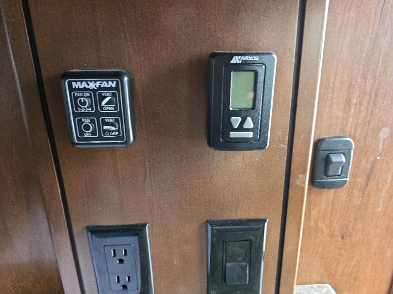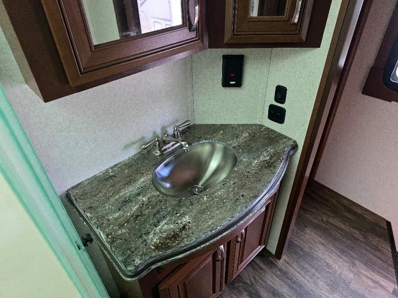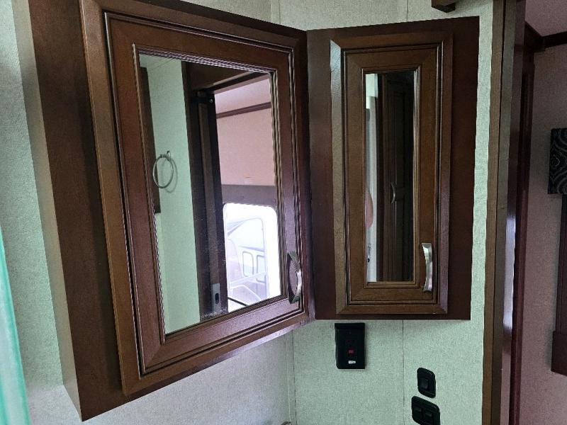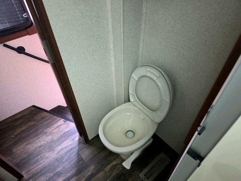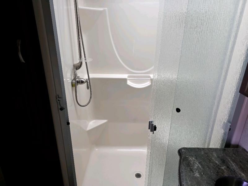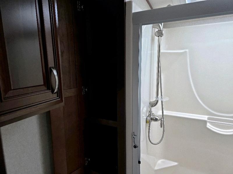 Head up the steps just to the right of the front most side entry door. Here you will find a complete bath on your left that includes a 36" wide shower, toilet, and a vanity with sink and overhead storage. You will also find a linen cabinet for your towels and toiletries.