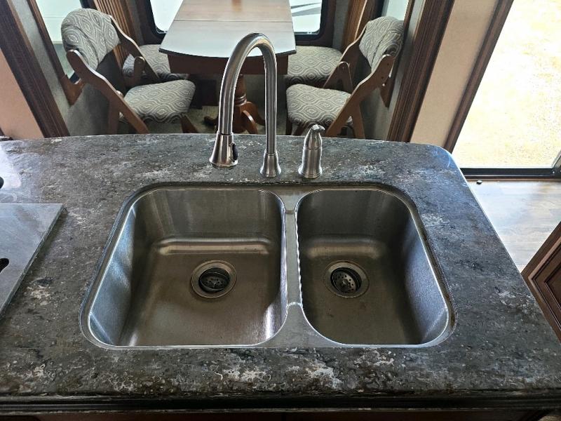 Head right through those same patio doors into a spacious kitchen area that will feel just like home. This too features dual opposing slide outs to create a wide open space. There is a slide out dinette for four along the curb side, a bar top with storage beneath along the interior rear space, and a bank of cabinets along the interior front wall. Along the road side find a slide out residential refrigerator, or choose an 18 cu. ft. option, a three burner range with overhead microwave oven, and a bit of counter space. There is more counter prep space at the kitchen island which also includes a double sink.